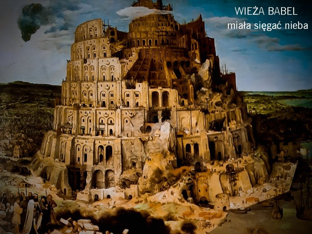 Kiedyś był tylko jeden język. Kiedy ludzie przenieśli się na wschód, przybyli do Mezopotamii i postanowili zbudować miasto z wypalonych cegieł mułowych. Zaczęli budować wieżę, która sięgałaby nieba, aby nie byli rozproszeni po całym świecie. Bóg spojrzał na miasto i wieżę i zobaczył, że język nie może ich powstrzymać i stają się zarozumiali. Postanowił więc pomieszać ich języki, aby jeden nie rozumiał drugiego. Rozrzucił ich i musieli zaprzestać budowy miasta. Od tego czasu nazwano wieżę – Babel ( w jęz. hebrajskim: zamieszanie).