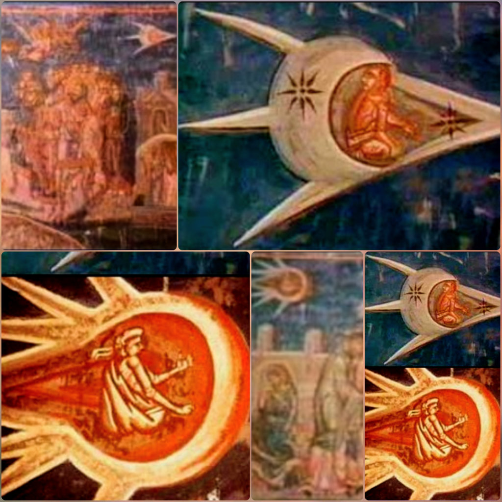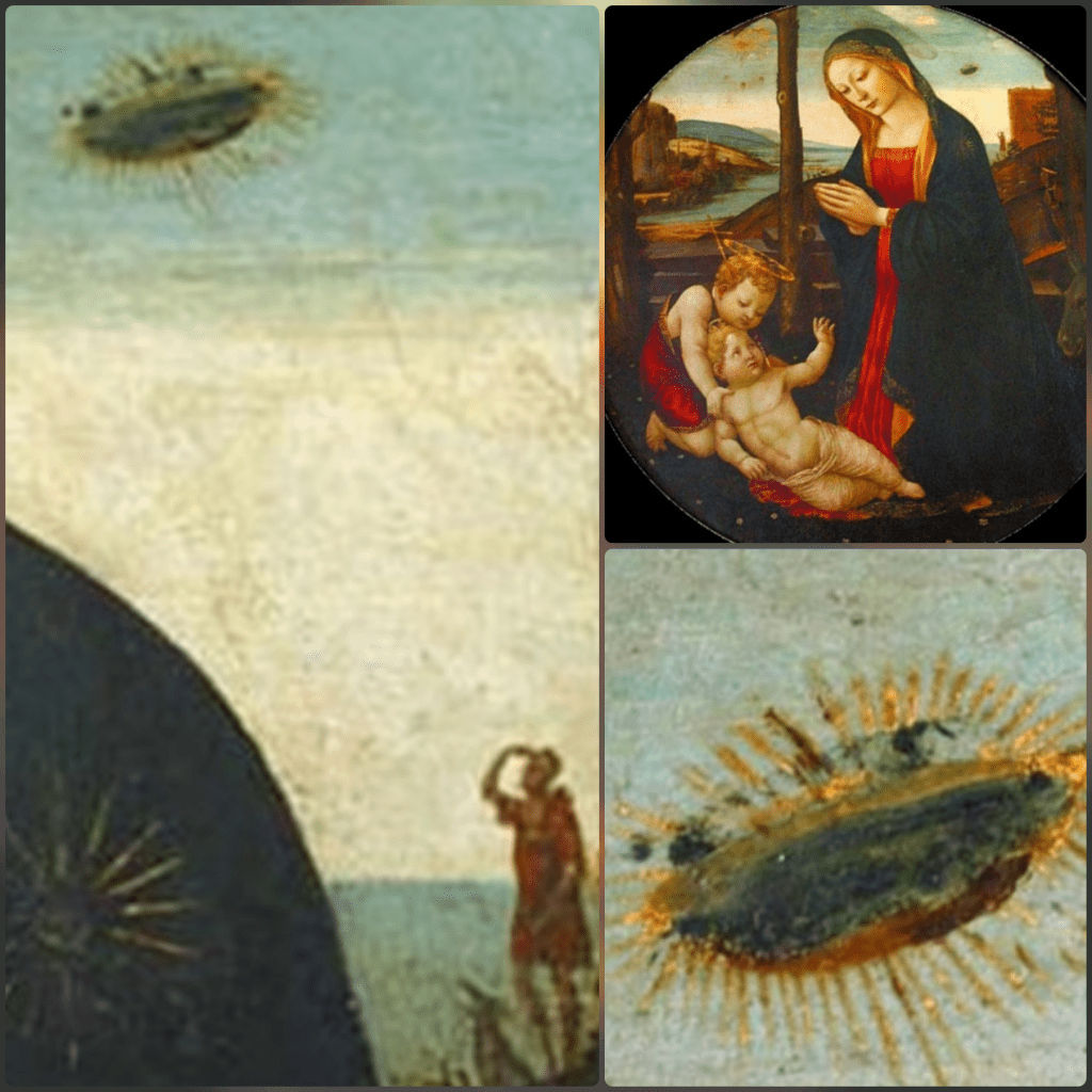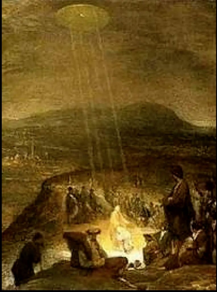 Podążając za spojrzeniem pasterza zobaczymy, jak artysta umieścił na sklepieniu nieba dość osobliwy element o okrągłym kształcie, z małymi wypukłościami, które przypominają coś w rodzaju latającego spodka.
