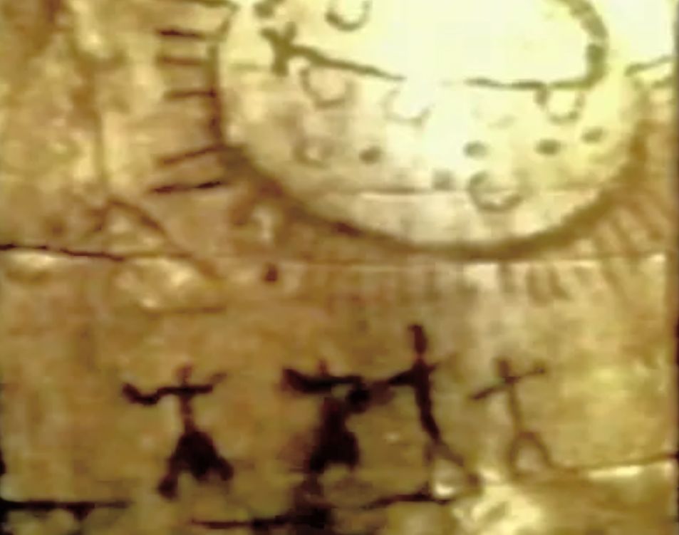 Jest to artystyczna reprodukcja płaskorzeźby znalezionej w labiryncie na japońskiej wyspie Jotuo na jeziorze Toengt’ing. Wyprawa odbyła się w 1957 roku (dwa lata przed trzęsieniem ziemi w tym rejonie). Wyprawą kierował profesor Tsj’i Pen-Lai. Znaleźli różne płaskorzeźby przedstawiające „ludzi” w dziwnych ubraniach, które wyglądały jak kombinezony astronautów. Znaleźli także obraz, który najwyraźniej przypominał układ słoneczny. Trzeci i czwarty okrąg (planeta) połączono linią. Było też dziesięć planet (nie licząc słońca jako planety).