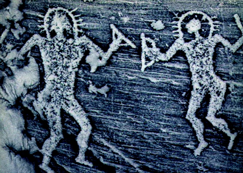 Datowane na 10 000 lat p.n.e., w tych włoskich jaskiniach znajduje się kilka dziwnych przedstawień. Wydaje się przedstawiać dwie istoty w strojach ochronnych, trzymające dziwne narzędzia. Aureola nad ich głowami, jest bardzo podobna do innych wczesnych rysunków i malowideł jaskiniowych.