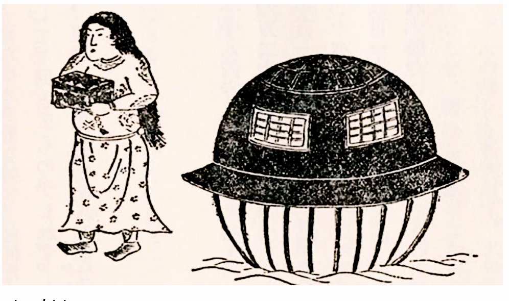 24 marca 1803 roku na plaży,,Harato-no- hama” w prowincji Hitachi dziwny „statek” został wyrzucony na brzeg. Przypominał świadkom urządzenie do gotowania ryżu, wokół środka miał pogrubiony brzeg. Był również pomalowany czarną farbą i miał cztery małe okienka ze wszystkich czterech stron. Okna były zakratowane i zatkane żywicą drzewną. Dno statku było chronione płytami z brązu, które wyglądały na wykonane z żelaza.najwyższej zachodniej jakości. Wysokość łodzi wynosiła 3,33 m, a szerokość 5,41 m. Na łodzi znaleziono 20-letnią kobietę o wzroście 1,5 m. skóra jej była biała jak śnieg. Długie włosy gładko opadały jej na plecy. Jej twarz była nieopisanie piękna. Kobieta była ubrana w nieznanym stylu, którego nikt nie znał. Mówiła w nieznanym języku. Trzymała małe pudełko, którego nikt nie mógł rozpoznać. Wewnątrz statku znaleziono dwa niezwykle miękkie dywaniki o nieznanej tkaninie. Były tam zapasy, takie jak ciasto, wyrabiane jedzenie i mięso. Znaleziono także pięknie zdobiony kubek z ozdobami, którego nikt nie mógł zidentyfikować.