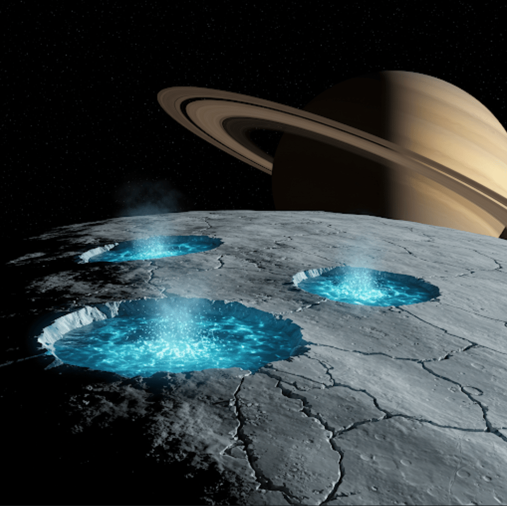 ENCELADUS (księżyc Saturna) posiada aktywne gejzery wyrzucające wodę i cząsteczki organiczne z podpowierzchniowego oceanu, co sugeruje, że może tam istnieć życie.