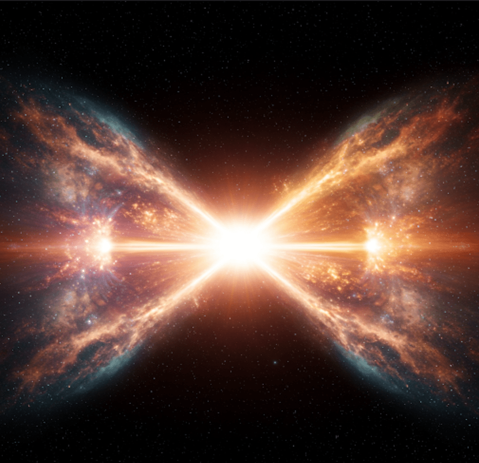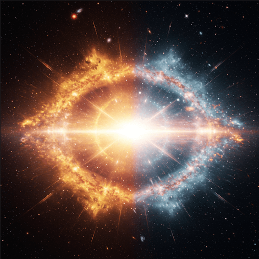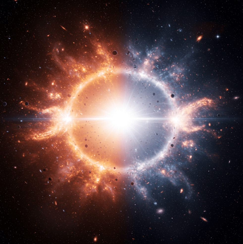 Mocny początek: Na początku był wybuch… Wielki Wybuch, który dał początek nie jednemu, ale dwóm wszechświatom. Oto wizja narodzin zarówno naszego wszechświata, jak i jego lustrzanego odbicia – antywszechświata. Z głębi nicości wyłaniają się dwa wszechświaty, bliźniacze w swym pochodzeniu, a jednak tak różne. Symetria czasu ukazuje moment stworzenia, gdzie materia i antymateria tańczą w kosmicznym uścisku. Wielki Wybuch w dwóch aktach: Spójrz na ten obraz, a zobaczysz Wielki Wybuch w zupełnie nowym świetle. To nie tylko początek naszego wszechświata, ale i narodziny jego lustrzanego odbicia – antywszechświata, gdzie prawa fizyki mogą być odwrócone. Czy kiedykolwiek zastanawiałeś się, co jest po drugiej stronie lustra? Ten obraz przenosi nas do granicy dwóch światów, gdzie nasz wszechświat spotyka się ze swoim lustrzanym odbiciem, antywszechświatem. W tym jednym momencie, w ułamku sekundy po Wielkim Wybuchu, powstały dwa wszechświaty – nasz, zbudowany z materii, i jego lustrzane odbicie, antywszechświat, zamieszkany przez antymaterię.