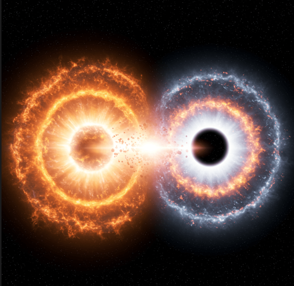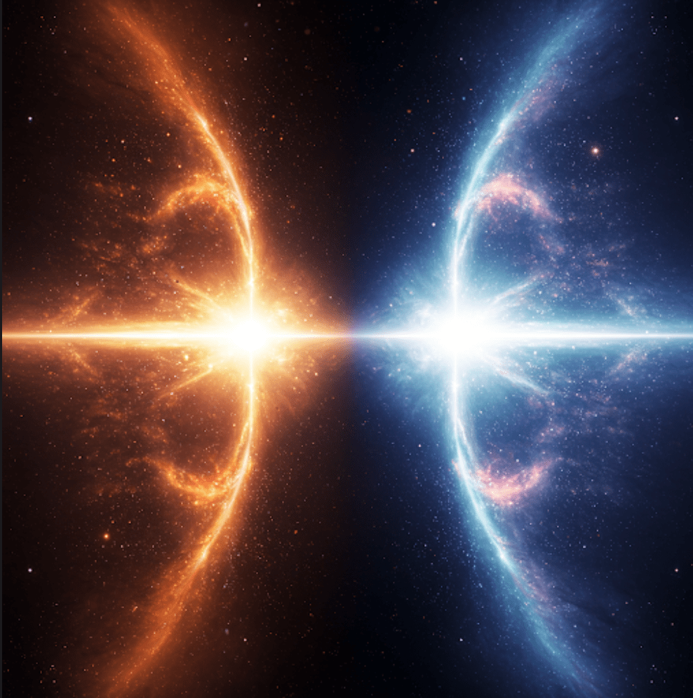 Na obrazie ten moment jest oznaczony przez centralny punkt, z którego rozchodzą się dwa „strumienie”. Te strumienie to nic innego jak dwa wszechświaty – nasz, który znamy, i jego lustrzane odbicie, czyli antywszechświat. Nasz wszechświat to ten, który widzimy na co dzień. Składa się z materii, czyli z atomów, gwiazd, planet i wszystkiego, co nas otacza. Antywszechświat to hipotetyczny wszechświat, który miałby być zbudowany z antymaterii. Antymateria to „lustrzane” odbicie materii – cząstki antymaterii mają takie same właściwości jak cząstki materii, ale z przeciwnym znakiem. Obraz, który oglądasz, próbuje pokazać, że te dwa wszechświaty powstały jednocześnie, w momencie Wielkiego Wybuchu. To właśnie dlatego widzisz symetrię na obrazie – obie strony są lustrzanym odbiciem siebie.