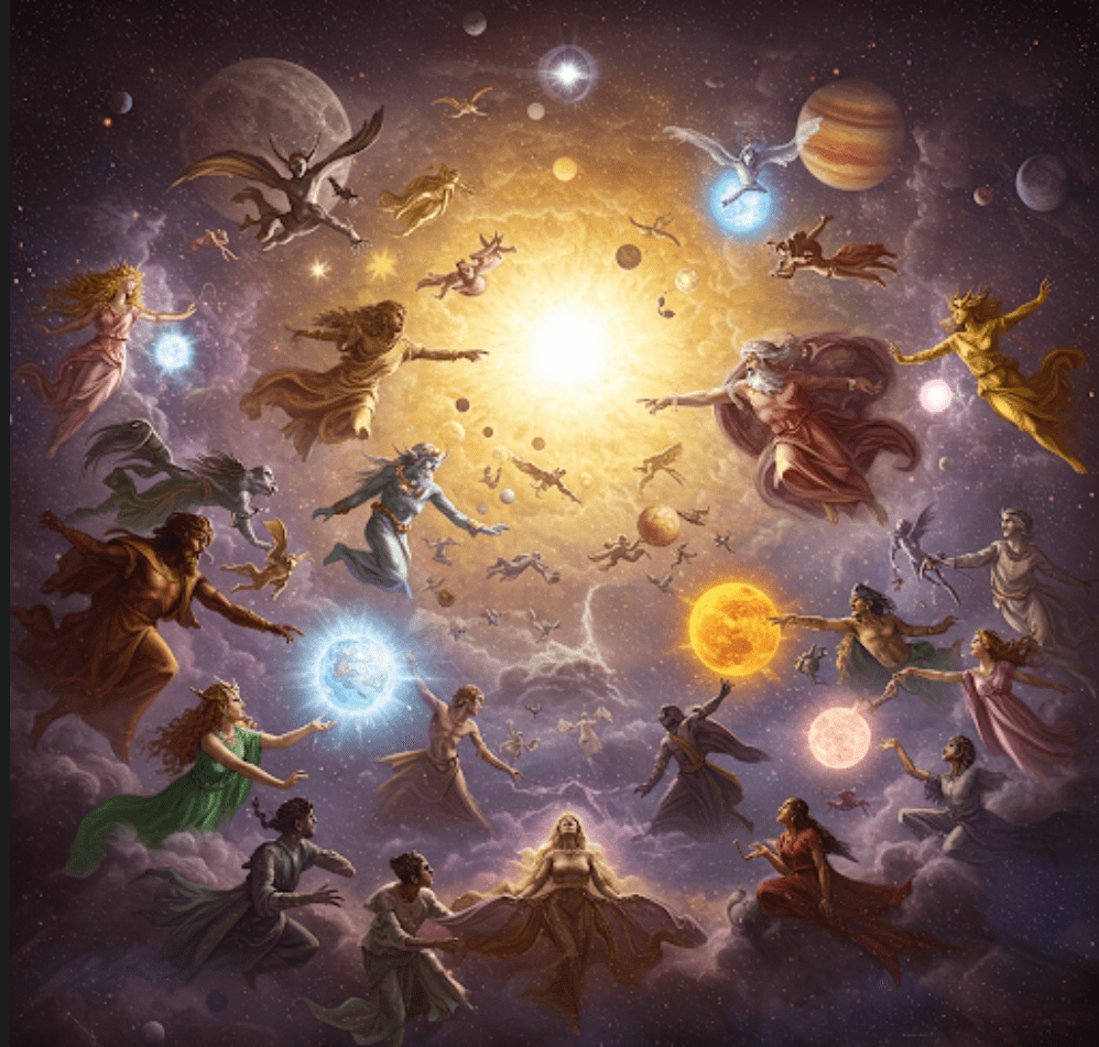 MITOLOGIA GRECKA: W mitologii greckiej istnieją opowieści o bogach i istotach kosmicznych, które zamieszkiwały niebo i inne planety. Na przykład, istniały legendy o bóstwach, które kontrolowały różne planety w naszym układzie słonecznym.