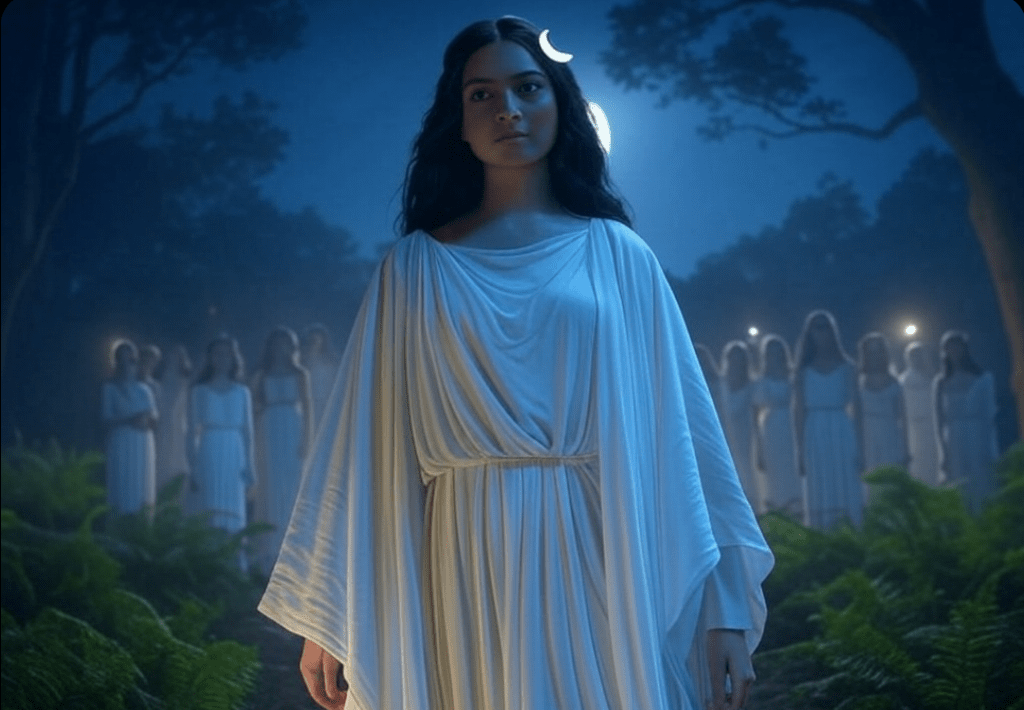 ARTEMIDA I KSIĘŻYC (mit grecki): Artemida, bogini łowów i księżycowa bogini, miała swoje towarzyszki w postaci dziewięciu nimf, które również zostały zamienione w gwiazdy.