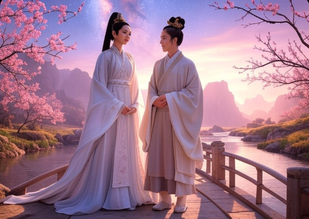 PTAK ZHINÜ I PASTERZ NIULANG (mit chiński): W chińskiej legendzie o „Ptaku Zhinü i Pasterzu Niulang”, ta para zakochanych została zamieniona w gwiazdy przez bogów, aby mogli być razem na niebie.