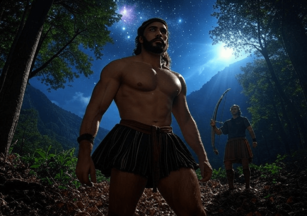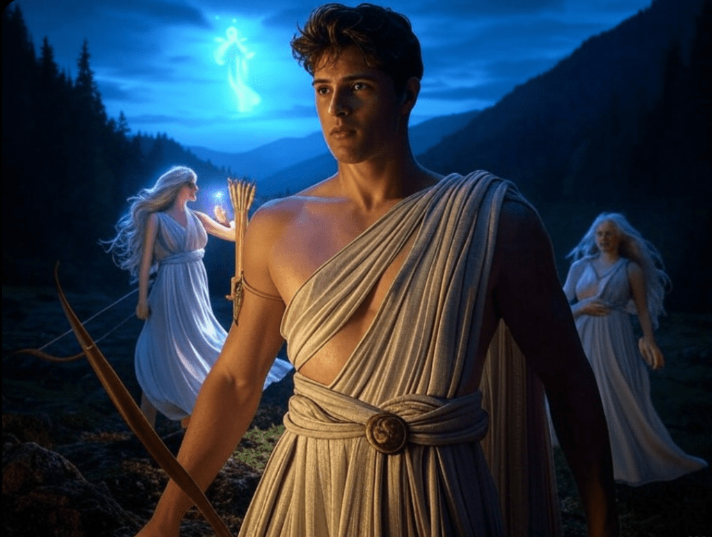 W mitologii greckiej istnieje opowieść, w której Orion, wielki myśliwy, ścigał nimfy, a konkretnie Plejady, czyli siedem córek tytana Atlasa i okeanidy Plejone. Plejady to: Maja, Elektra, Taygete, Alkyone, Kelajno, Sterope i Merope. Mit różni się w zależności od wersji, ale jedna z popularnych historii mówi, że Orion zakochał się w Plejadach lub pożądał ich, co skłoniło je do ucieczki przed nim.W tej opowieści nimfy uciekały przez wiele lat, aż w końcu Zeus (lub w niektórych wersjach Artemida) ulitował się nad nimi i przemienił je w gwiazdy, tworząc gromadę Plejad w gwiazdozbiorze Byka. Orion również został umieszczony na niebie jako gwiazdozbiór, ale w taki sposób, że wciąż wydaje się „ścigać” Plejady – stąd ich bliskość na firmamencie. Gwiazdozbiór Oriona z charakterystycznym Pasem Oriona (Alnitak, Alnilam, Mintaka) jest widoczny niedaleko Plejad, co symbolizuje tę wieczną pogoń.