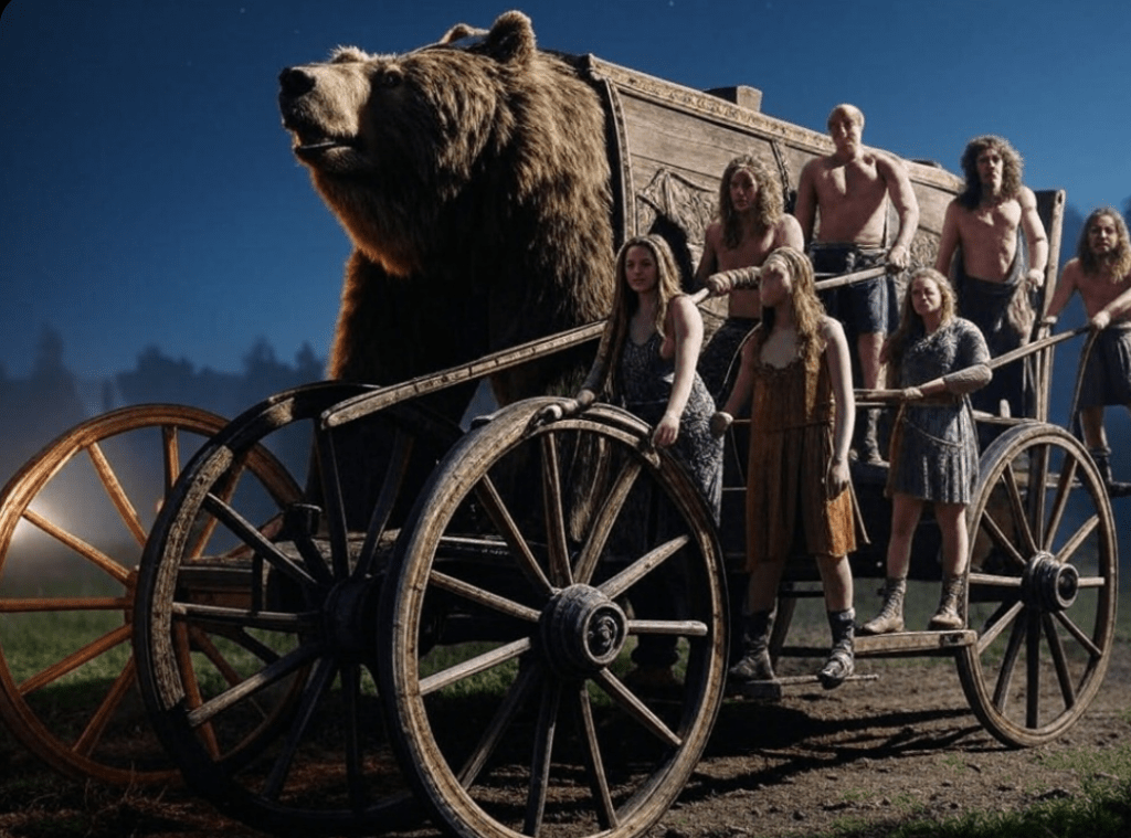 Dawno temu, w czasach, gdy świat był młody, a bogowie z Asgardu wciąż chodzili wśród ludzi, na niebie pojawił się wielki wóz, który stał się znany jako Wielka Niedźwiedzica. Nie był to zwykły wóz – jego koła kręciły się z mocą siedmiu dusz, wybranych przez Odyna, wszechojca, by strzec porządku między Midgardem a gwiazdami.Pewnego dnia, w Midgardzie, krainie ludzi, wybuchła wielka wojna między plemionami. Trzej bracia – Bjorn, Hrolf i Sigurd – walczyli ramię w ramię, słynąc z odwagi i siły. Byli oni wojownikami o sercach tak czystych, że nawet Thor, bóg grzmotów, spoglądał na nich z uznaniem. Z kolei w wiosce nad fiordem żyły cztery siostry – Astrid, Frida, Gudrun i Sigrid – znane z mądrości, umiejętności tkania losów i śpiewu, który uspokajał nawet najdziksze burze. Ich pieśni przyciągały uwagę Frei, bogini miłości i magii.Wojna trwała latami, aż w końcu bracia i siostry spotkali się na polu bitwy. Nie walczyli przeciwko sobie, lecz połączyli siły, by zakończyć konflikt. Bracia używali mieczy i tarcz, a siostry splatały zaklęcia i śpiewały pieśni, które osłabiały wrogów. W decydującym momencie, gdy zwycięstwo było blisko, olbrzym z Jotunheimu, wściekły na ludzką śmiałość, zszedł na ziemię i jednym ciosem pozbawił życia całą siódemkę.Odyn, obserwujący wszystko z tronu Hlidskjalf, nie mógł pozwolić, by tak szlachetne dusze zniknęły w otchłani. Wraz z Frei postanowili uhonorować ich odwagę i mądrość. Trzy męskie dusze – Bjorna, Hrolfa i Sigurda – umieszczono w przednich gwiazdach wozu, by prowadziły go z siłą i niezłomnością. Cztery kobiece dusze – Astrid, Fridy, Gudrun i Sigrid – stały się tylnymi gwiazdami, napędzającymi koła swoją harmonią i magią. Razem stworzyli Wielki Wóz, który miał wiecznie krążyć po niebie jako przypomnienie o jedności, odwadze i mądrości.Wóz ten, ciągnięty przez niewidzialne wilki Odyna, służył też jako znak dla żeglarzy i wędrowców. Mówiono, że gdy ktoś zgubił drogę w ciemności, wystarczyło spojrzeć na Wielką Niedźwiedzicę, a dusze wojowników i pieśniarek wskażą mu drogę do domu. Niektórzy szeptali, że w bezgwiezdne noce można usłyszeć odległy śpiew sióstr, mieszający się z echem wojennych okrzyków braci.Ta opowieść oddaje ducha nordyckiej mitologii, w której gwiazdy często symbolizowały dusze zmarłych bohaterów lub boskie dary dla ludzkości. Wielka Niedźwiedzica, jako jeden z najbardziej rozpoznawalnych gwiazdozbiorów na półkuli północnej, mogła być naturalnym obiektem takich legend wśród wikingów, którzy cenili zarówno siłę fizyczną, jak i duchową harmonię.