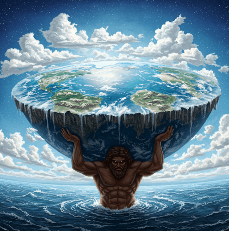 MITOLOGIA GRECKA: W mitologii greckiej często przedstawiano Ziemię jako płaski dysk, otoczony przez rzekę Oceanu i podtrzymywany przez boga Atlasa.
