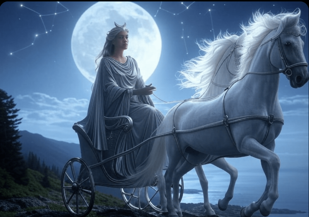MITY NORDYCKIE: W mitologii nordyckiej istnieją opowieści o bogini Księżyca, Mani, która wędruje przez niebo na koniu z bratem Słońca.