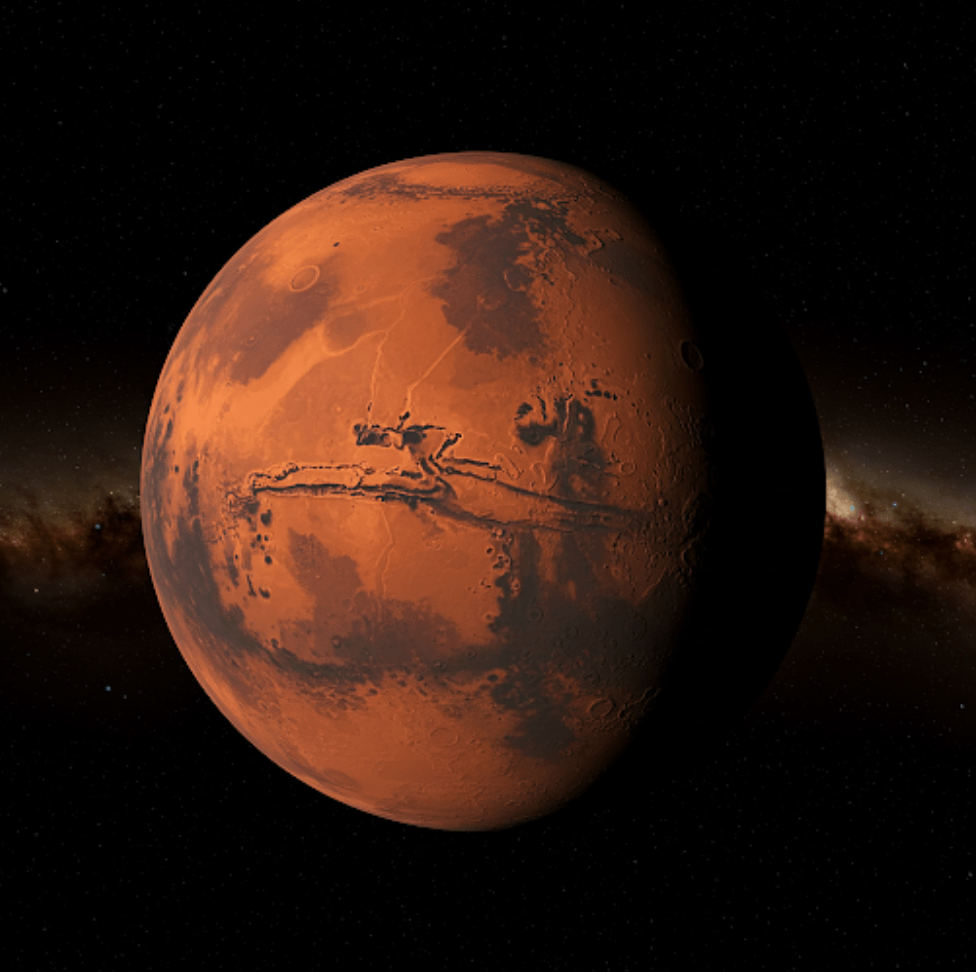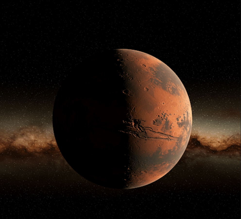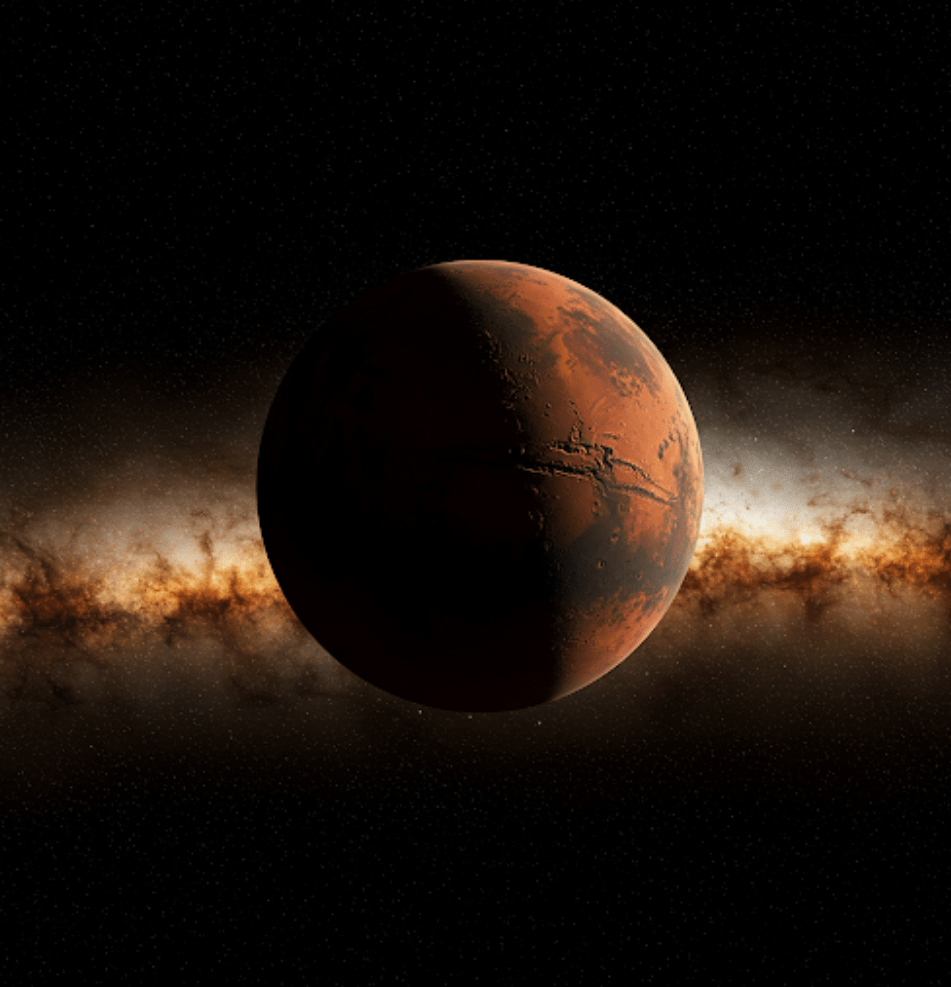 Mars, znany jako Czerwona Planeta, jest czwartą planetą od Słońca. Jego powierzchnia, zbudowana głównie z bazaltu, charakteryzuje się różnorodnym ukształtowaniem terenu, w tym górami, dolinami i wulkanami. Mars ma cieńszą atmosferę, składającą się w 95% z dwutlenku węgla, co czyni go nieprzyjaznym dla ludzi. W planach NASA znajduje się wysłanie załogowej misji na Marsa w ciągu najbliższych 10-20 lat, a także badania potencjalnych oznak życia oraz przygotowanie do przyszłych misji