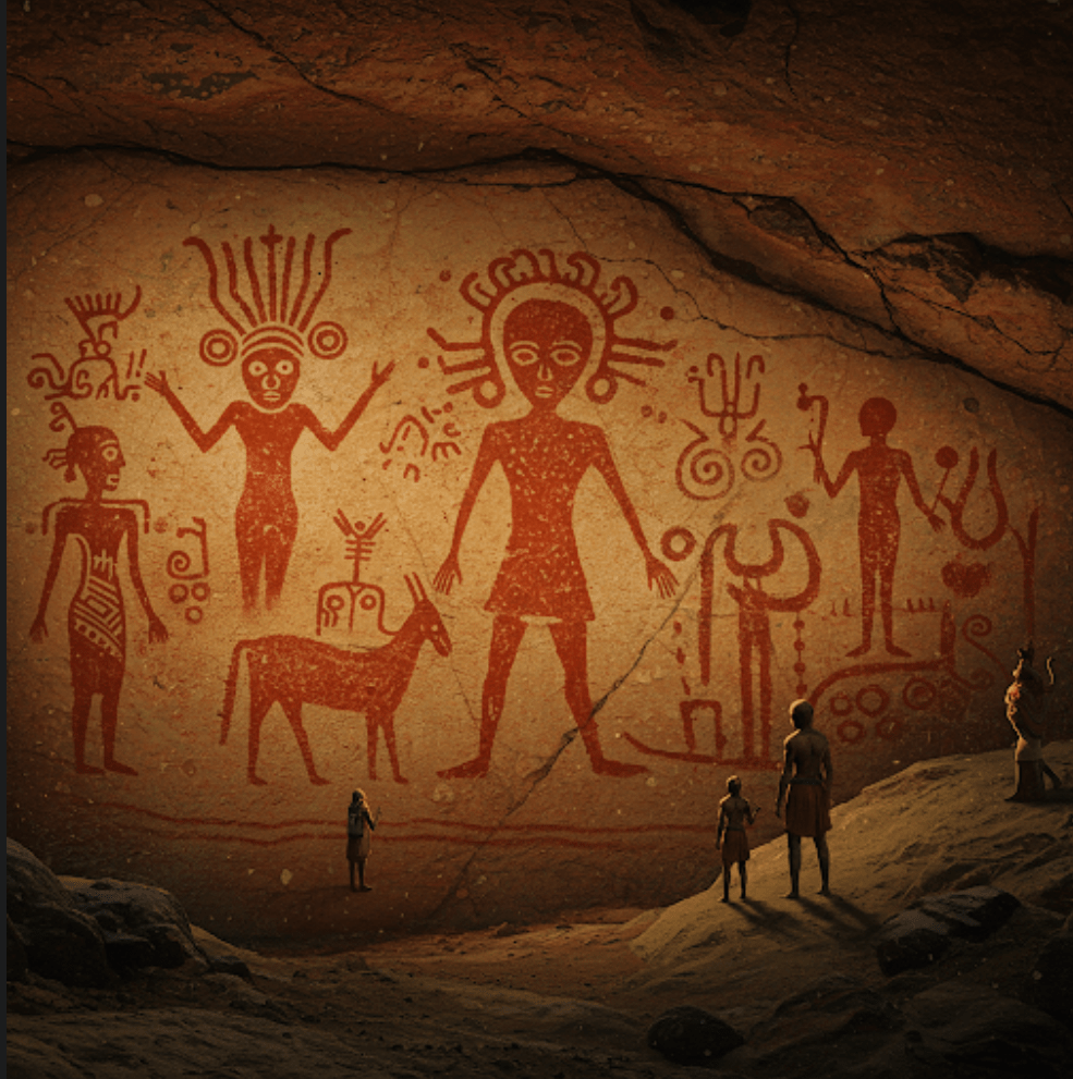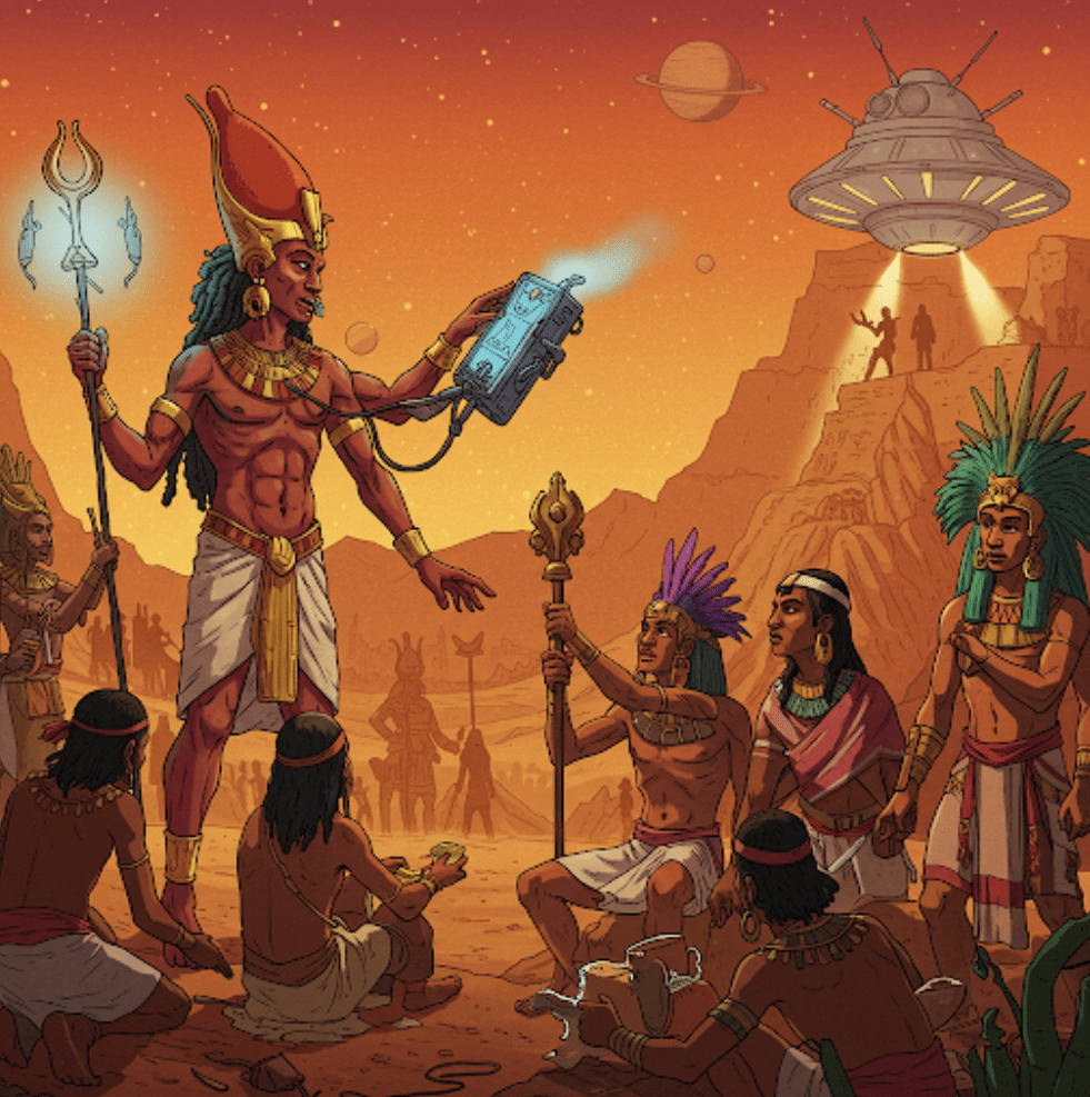 Pewne teorie spiskowe sugerują, że mity o bogach w różnych kulturach mogą w rzeczywistości odnosić się do wizyt Marsjan na Ziemi w odległej przeszłości. Twórcy tej teorii powołują się na podobieństwa między niektórymi symbolami oraz mitami różnych kultur a możliwymi obrazami z Marsa, sugerując, że Marsjanie mogli mieć wpływ na rozwój cywilizacji ludzkiej.