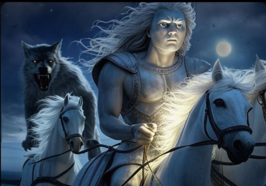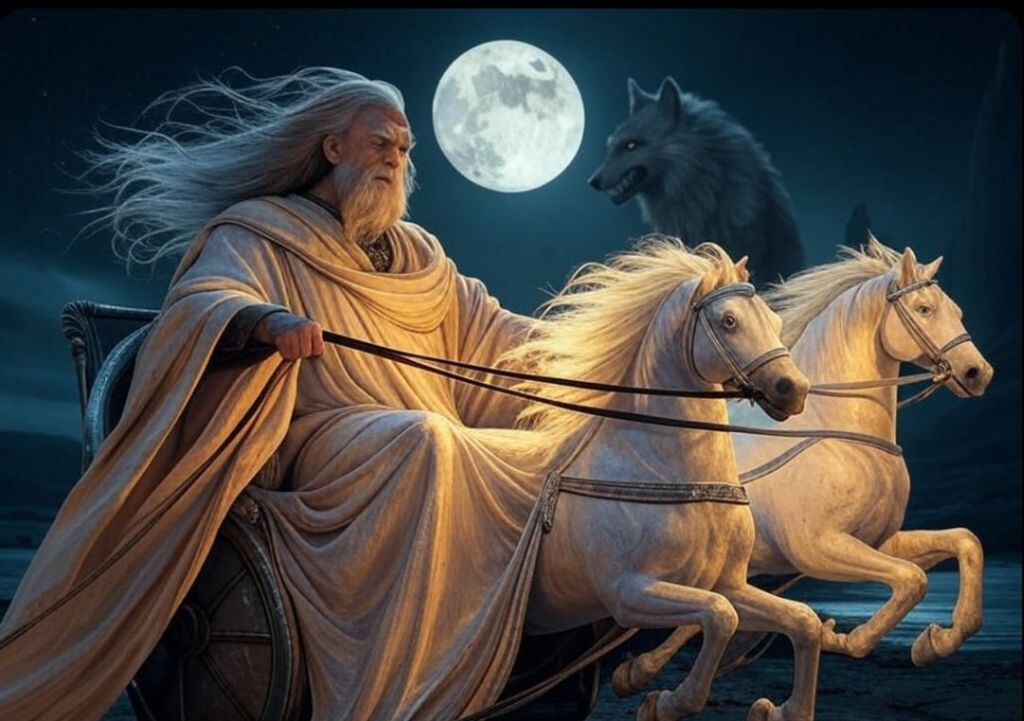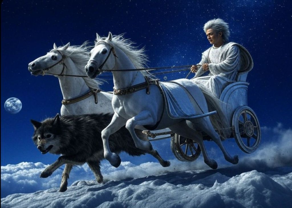 Máni – Bóg Księżyca, który podróżuje po niebie w rydwanie, ścigany przez wilka.