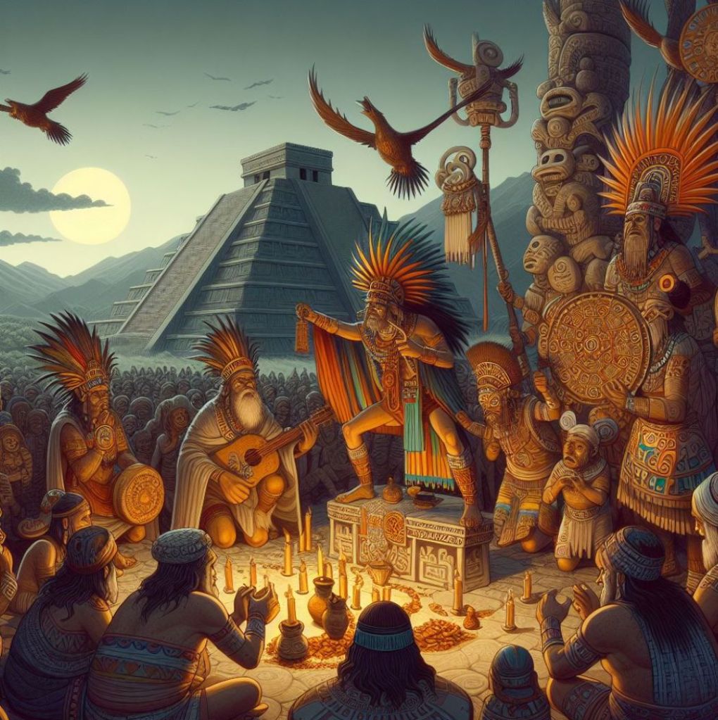 5. **Rytuały Azteków**: Aztekowie przeprowadzali liczne rytuały religijne, w tym ofiary z ludzi podczas ważnych ceremonii, takich jak obrzędy ku czci bogów.