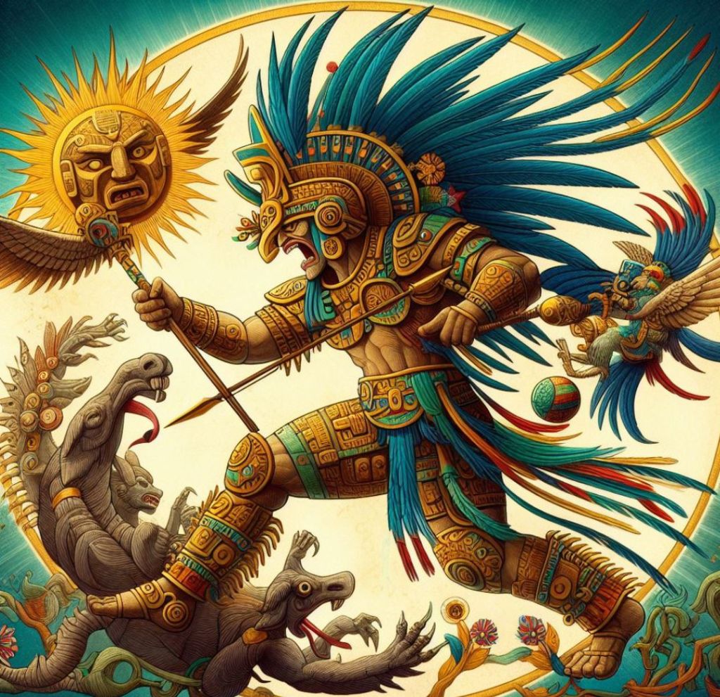 Według legendy, Huitzilopochtli narodził się jako wojownik, który walczył ze swoimi braćmi i siostrami, aby obronić swoją matkę, boginię Coatlicue.