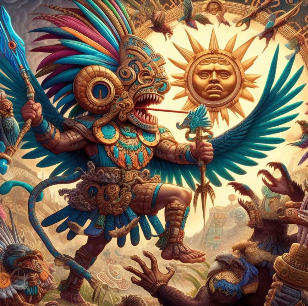 Huitzilopochtli to jedno z najważniejszych bóstw Azteków, znany jako bóg wojny i słońca. Według legendy, Huitzilopochtli urodził się w pełnej zbroi i z niebieskim oszczepem, a na głowie miał pióra kolibra. Zaraz po narodzinach pokonał swoją siostrę Coyolxauhqui oraz swoich braci Centzon-Huitznahuas, którzy spiskowali przeciwko ich matce, Coatlicue. Jako słoneczny wojownik, Huitzilopochtli odradzał się każdego dnia z krwi i ognia, a jego kult wymagał składania ludzkich ofiar1. Aztekowie wierzyli, że ich misją i zadaniem jest prowadzenie wojen, aby zaspokoić swoich bogów, co było częścią ich ekspansji i podbojów1.