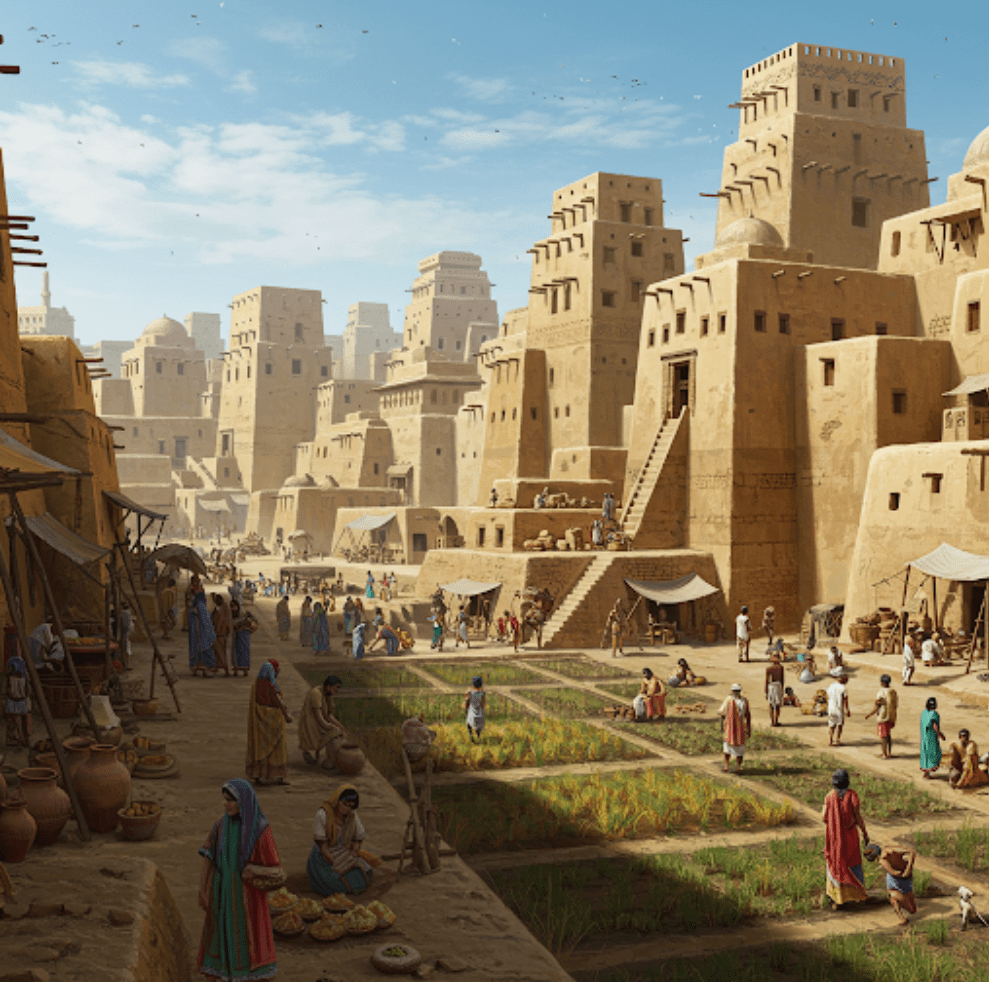 Cywilizacja Doliny Indusu posiadała dobrze zaplanowane miasta, takie jak Mohendżo-Daro i Harappa, z regularnymi ulicami, systemami kanalizacyjnymi i dobrze zorganizowanymi budynkami mieszkalnymi i publicznymi.