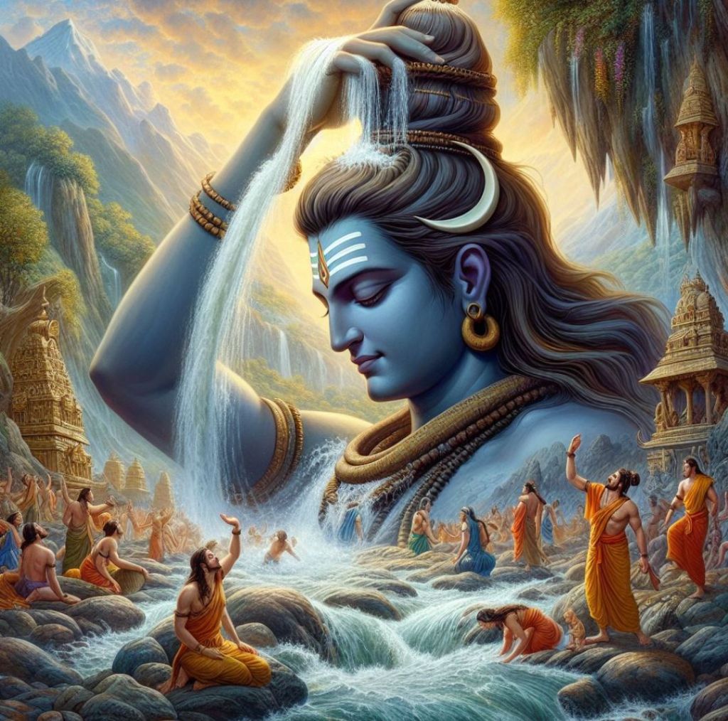 Według mitologii hinduskiej, Ganga zstąpiła z niebios na ziemię, aby oczyścić dusze przodków króla Bhagirathy. Historia ta mówi, że Bhagiratha, pragnąc zbawienia dla swoich przodków, przez wiele lat modlił się i medytował, aż w końcu bóg Brahma usłyszał jego prośby i nakazał bogini Ganga, by zstąpiła na ziemię. Jednakże jej gwałtowny nurt mógłby zniszczyć ziemię, więc bóg Śiwa przyjął rzekę na swoją głowę, łagodząc jej upadek, a następnie delikatnie pozwolił jej spłynąć na ziemię.