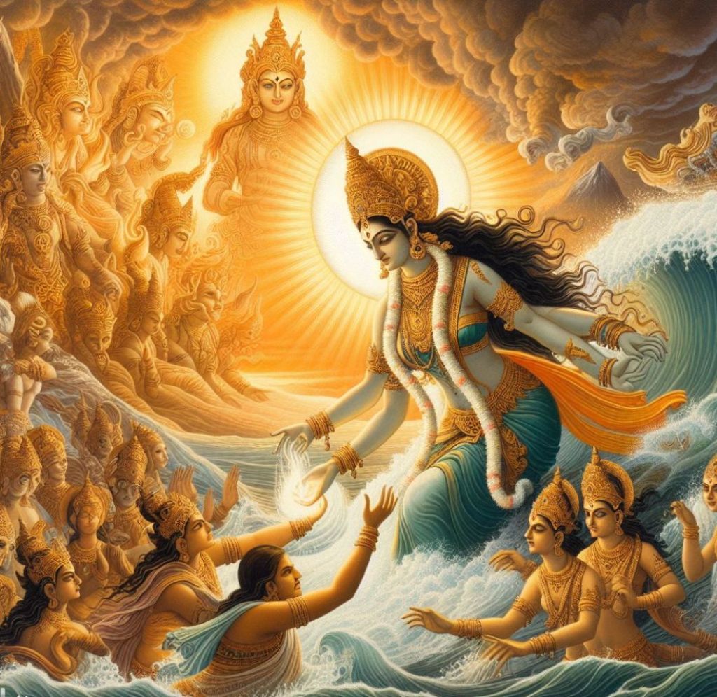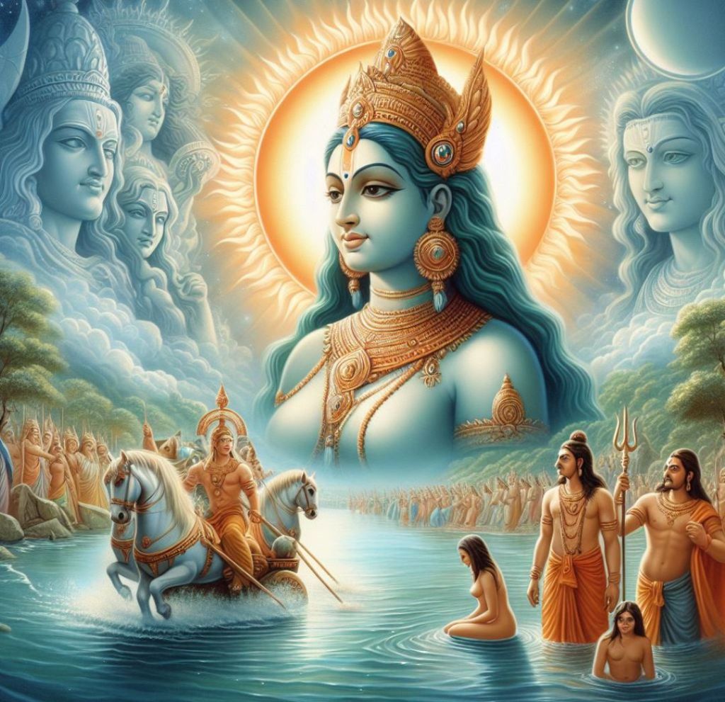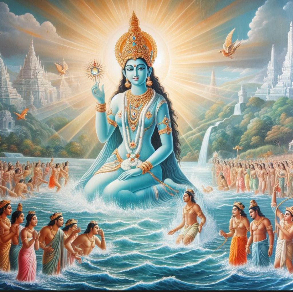 Z jej boskiego ciała wytrysnęły strumienie czystej, świętej wody, które rozlały się po ziemi, tworząc rzekę. Wody Jamuny płynęły przez zielone doliny i suche pustynie, przynosząc życie tam, gdzie tylko mogły. Ludzie z daleka i bliska przybywali, aby zanurzyć się w jej łaskawych falach, znajdując ukojenie dla swoich dusz i serc.