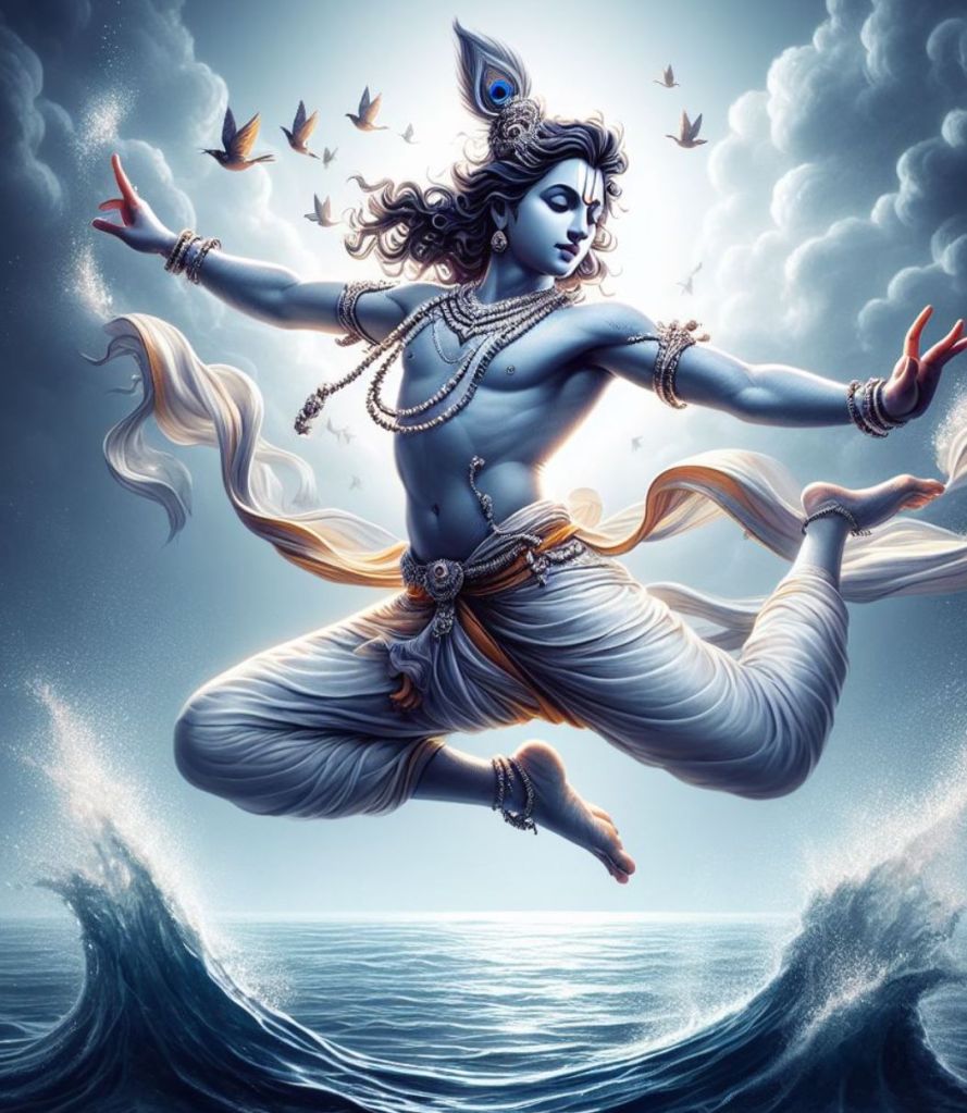 Młody Kryszna tańczy, śmieje się i śpiewa słodko.