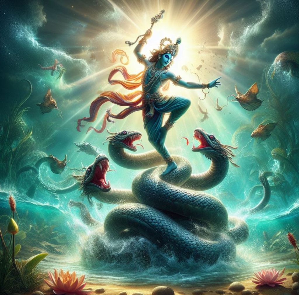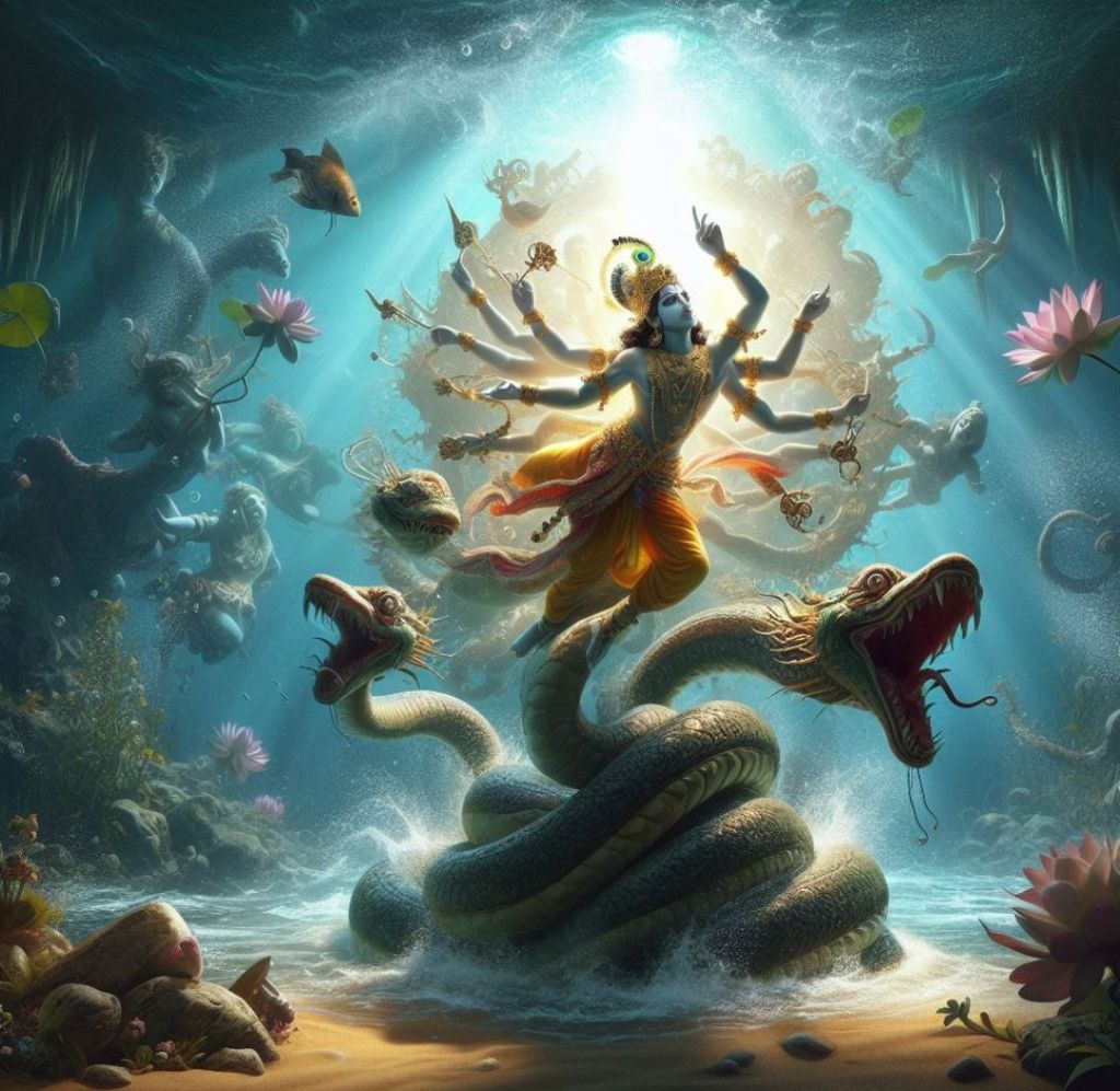 Rzeka Jamuna przepływała przez Vrindavan, miejsce pełne pięknych ogrodów, pastwisk i wiosek, gdzie młody Kryszna spędzał swoje dzieciństwo. Wody Jamuny były jednak zatrute przez jadowitego węża Kaliya, który żył na jej dnie. Jego trucizna sprawiała, że woda stała się czarna i niebezpieczna dla życia wokół niej. Ludzie i zwierzęta unikali zbliżania się do rzeki, bojąc się śmierci.