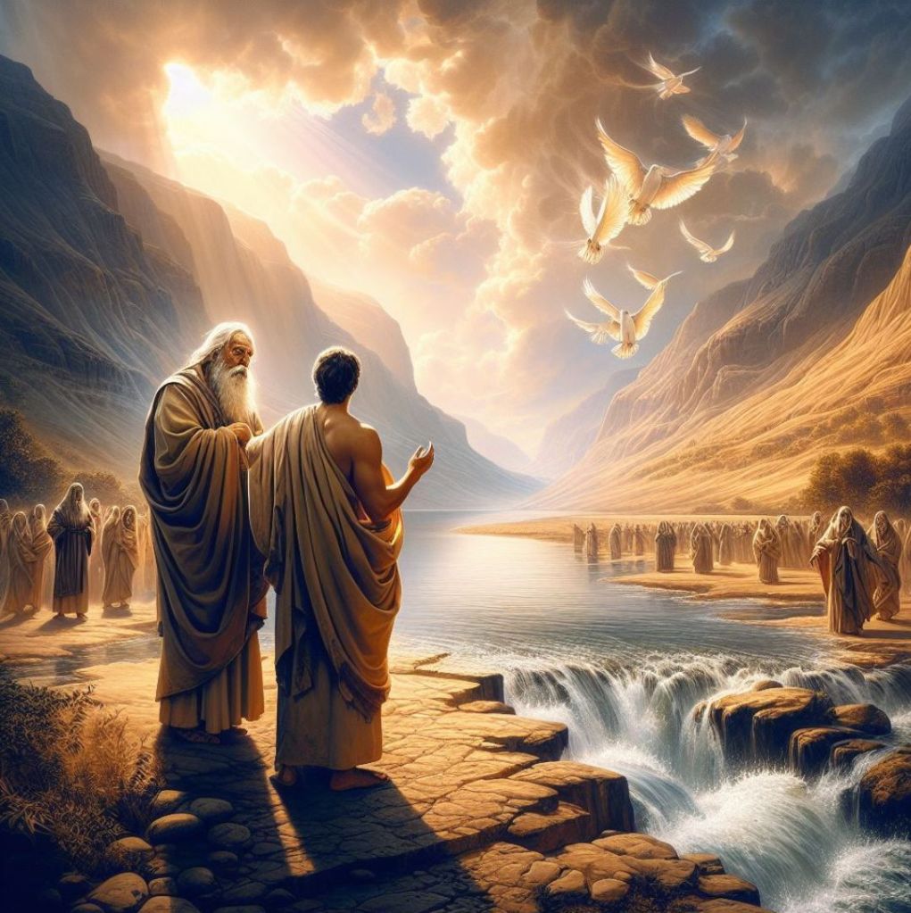 „Wziął wtedy Eliasz swój płaszcz, zwinął go i uderzył w wodę, która się rozstąpiła na dwoje, i przeszli obydwaj suchą nogą.”