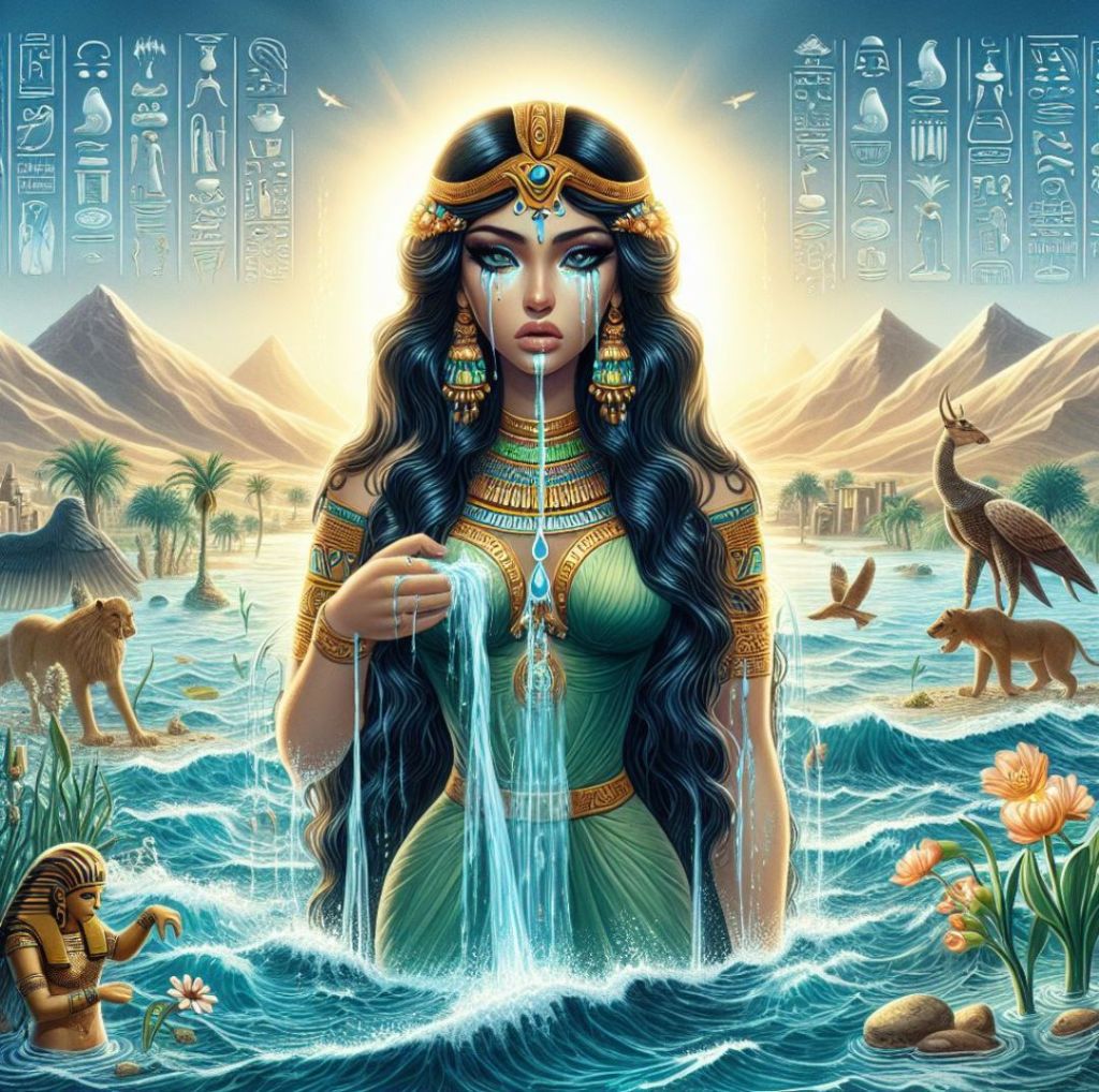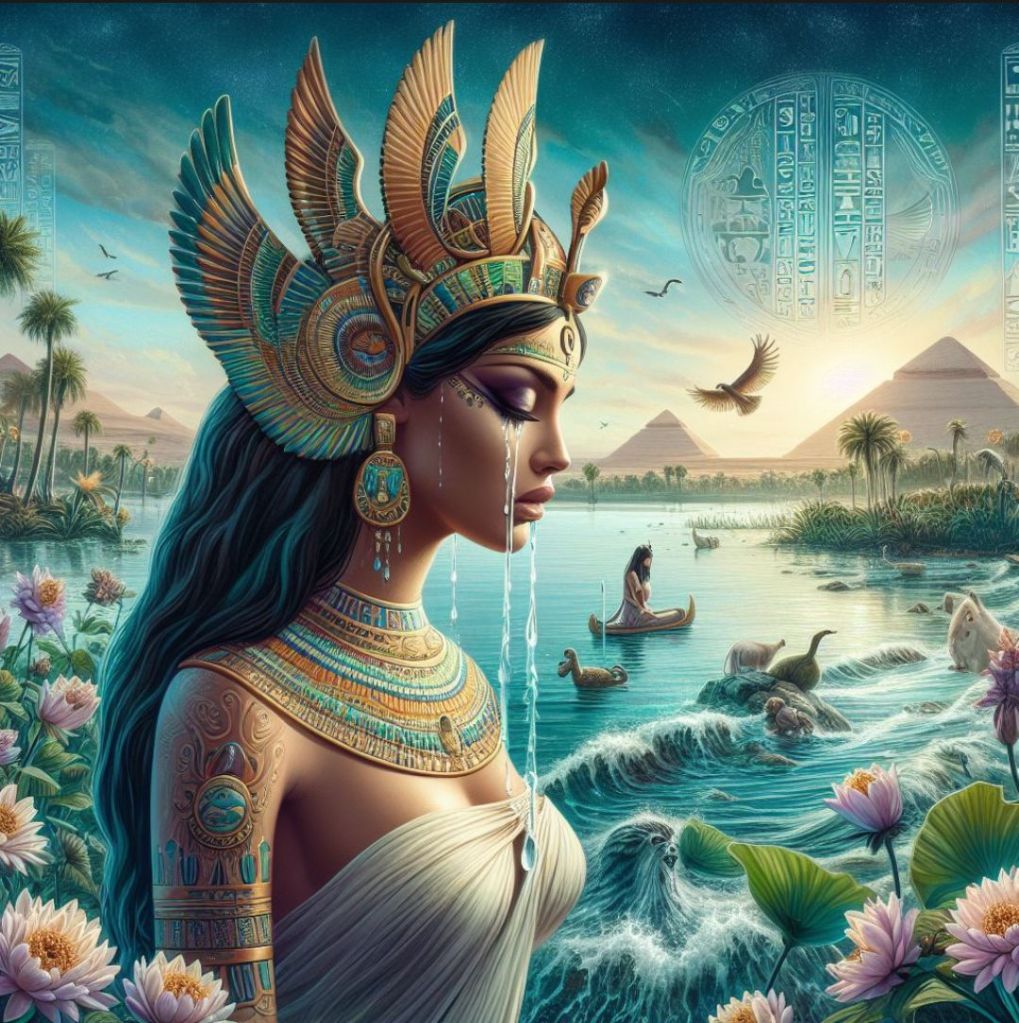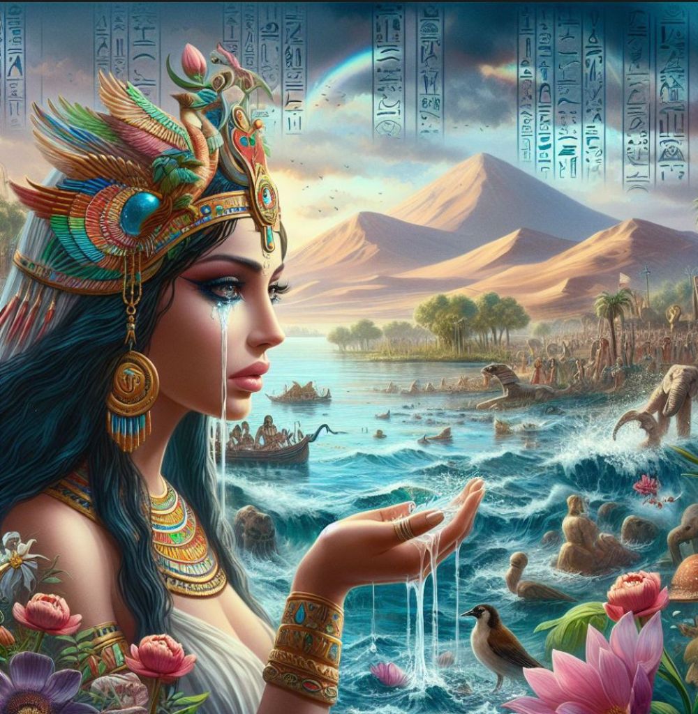 Opowieść o łzach Izydy jest jedną z najbardziej poetyckich legend związanych z Nilem. Według tej legendy, każdego roku, w okresie wylewów Nilu, Izyda płakała nad śmiercią swojego męża Ozyrysa. Jej łzy, które spadały do rzeki, miały magiczną moc i były uważane za przyczynę corocznych powodzi Nilu, które przynosiły żyzne muł na brzegi, umożliwiając uprawę roślin i zapewniając dobrobyt mieszkańcom Egiptu.