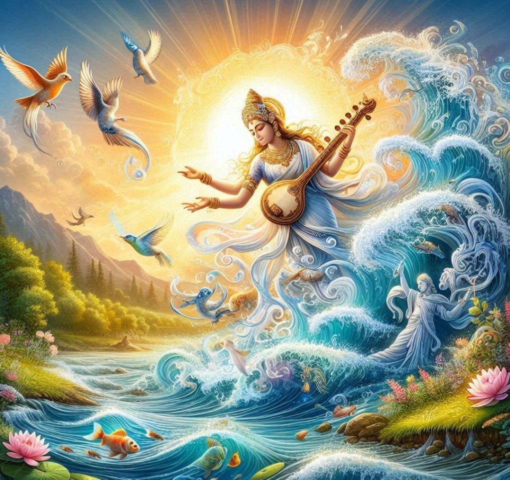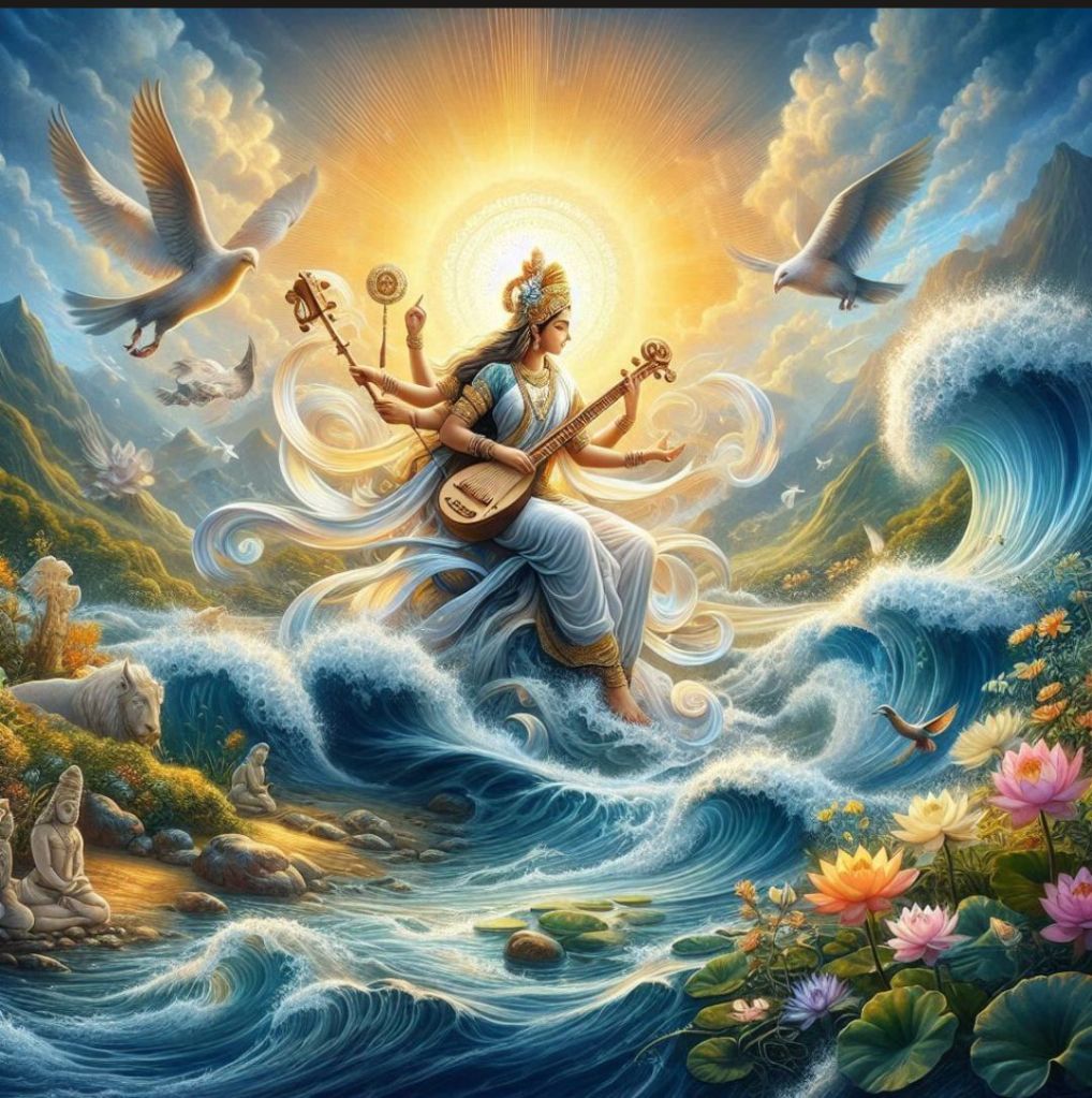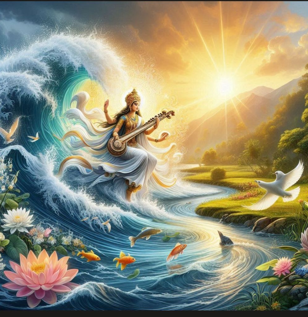 W hinduizmie Saraswati jest również uosobieniem rzeki, która później rozwinęła się w niezależną tożsamość jako bogini Saraswati. Ta ewolucja z rzeki do bogini odzwierciedla głębokie znaczenie wody jako źródła życia i inspiracji w starożytnej kulturze indyjskiej. Jest często przedstawiana jako jeżdżąca na czysto białej gęsi, zdolnej do długich lotów, trzymająca w rękach instrument muzyczny (veena) oraz manuskrypt lub książkę.