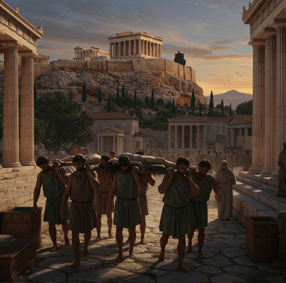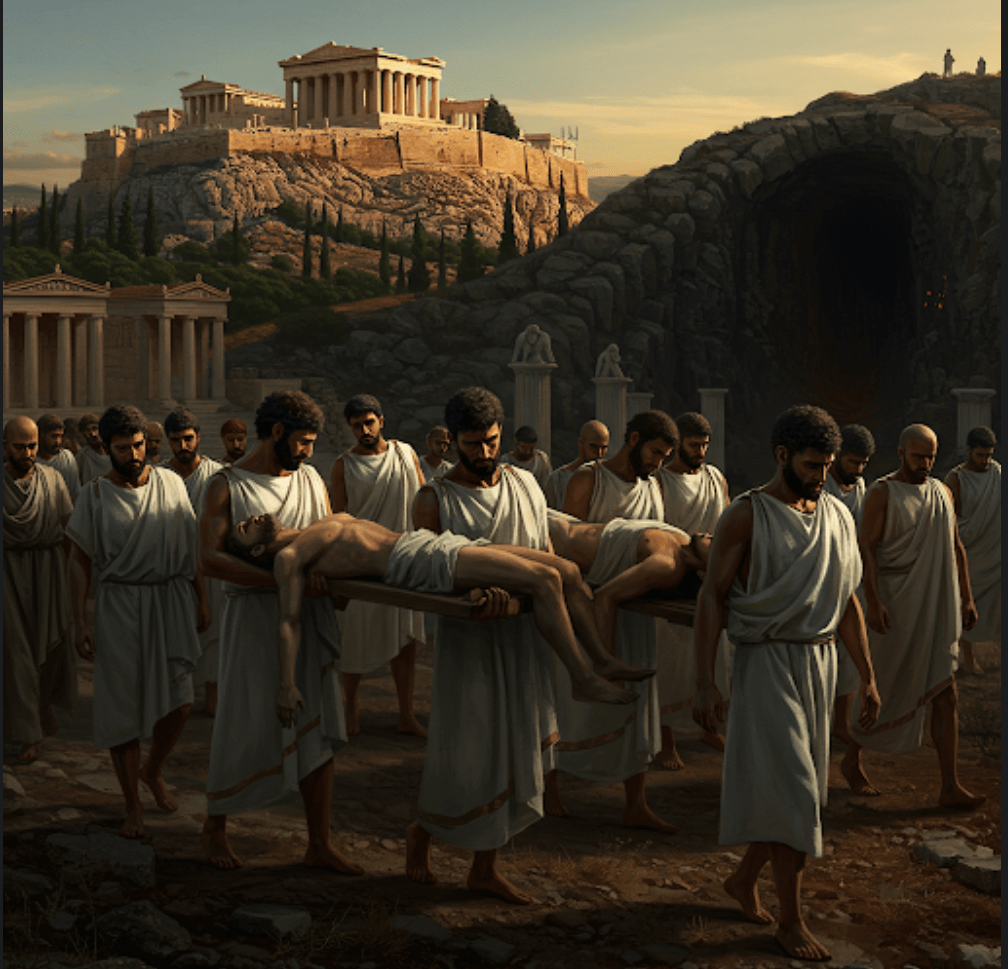 W demokratycznych Atenach odpowiednikiem tych miejsc był Baratron (lobaretron Barathron) – głęboka, naturalna przepaść położona za wzgórzem Akropolu. Wrzucano tam ciała straconych przestępców, morderców i zdrajców, a czasem także wykonując egzekucję przez zrzucenie żywcem. Diodor Sycylijski wspomina, że podczas tyranii Trzydziestu Tyranów w Atenach, do Baratronu wrzucono ciała wielu obywateli, co miało wymiar symbolicznego pozbawienia ich czci i prawa do godnego pochówku[^4]. Funkcja Baratronu była dwojaka: praktyczna – jako szybka i higieniczna (jak na ówczesne standardy) metoda dyspozycji ciał, oraz symboliczna – stanowił akt całkowitego wykluczenia winowajcy ze społeczności, zarówno za życia, jak i po śmierci. Był to fizyczny i metaforyczny „dół zapomnienia”.