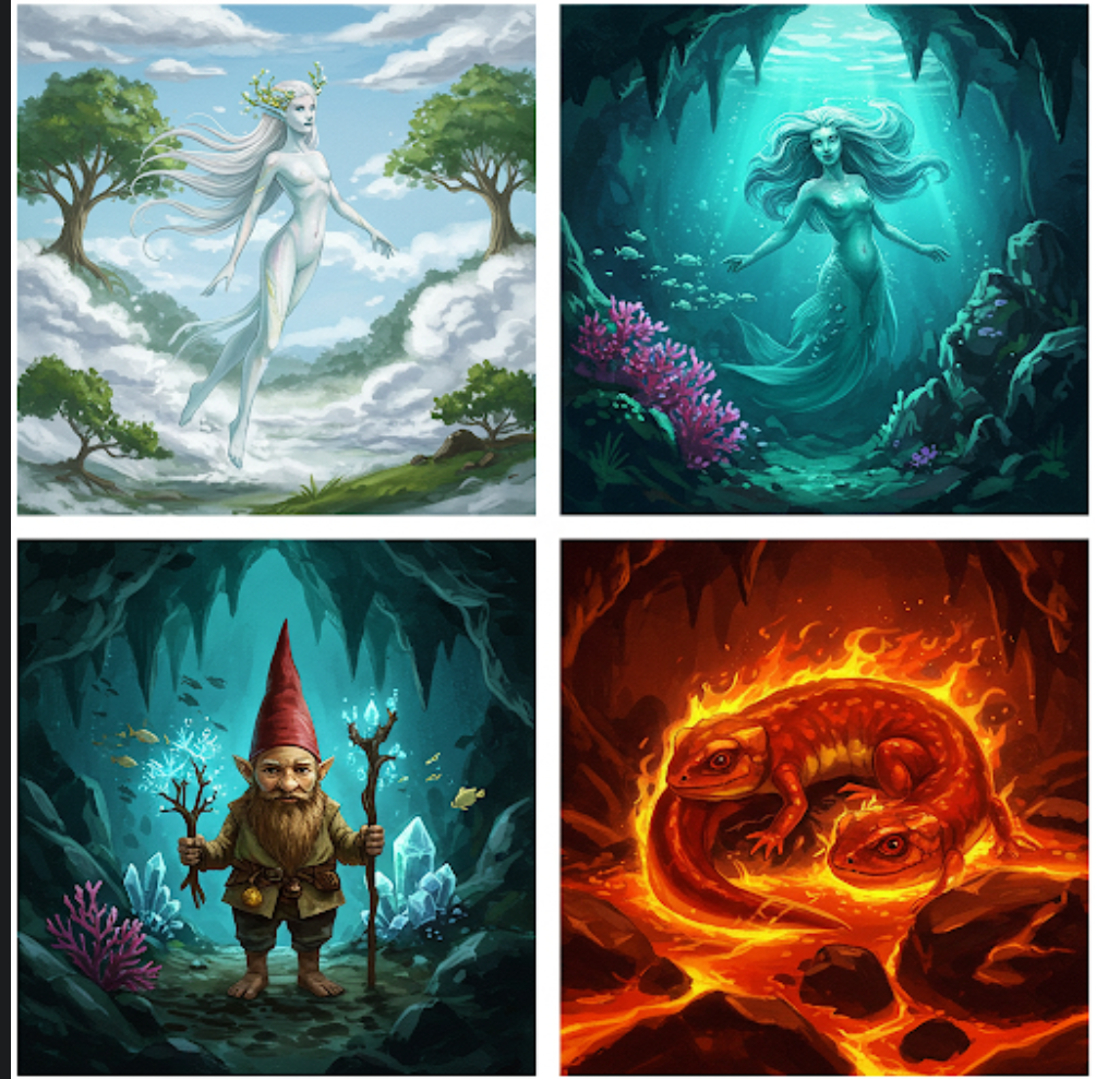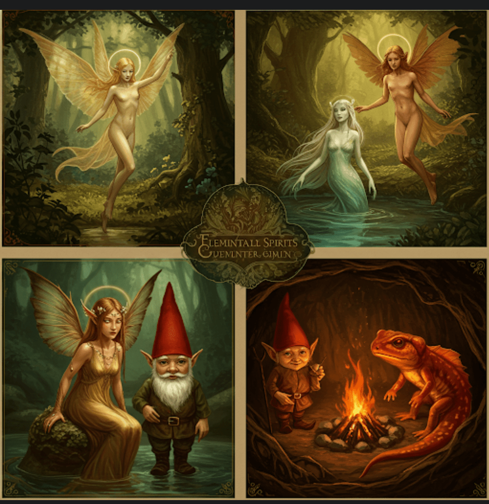 GNOME (ZIEMIA): Są to duchy związane z ziemią, przedstawiane jako strażnicy skarbów, minerałów i roślinności. Znane są z pracy pod ziemią i opieki nad naturalnymi bogactwami.