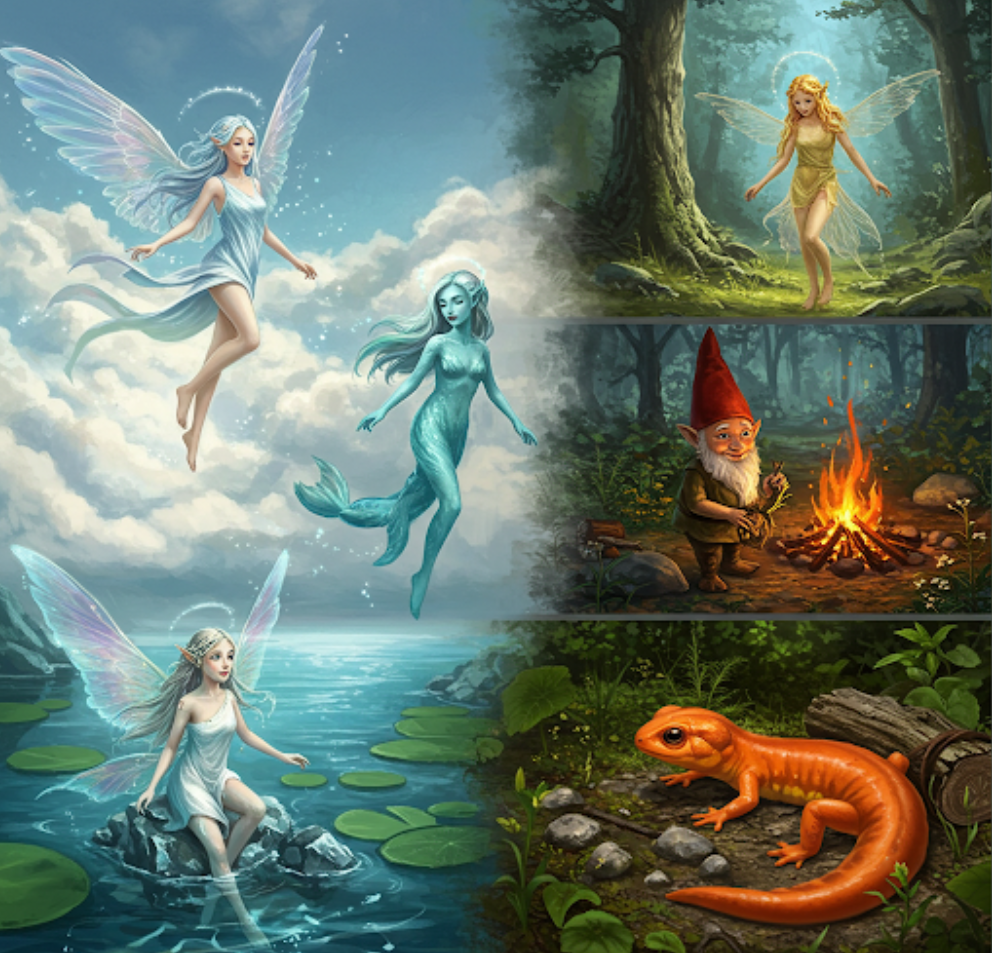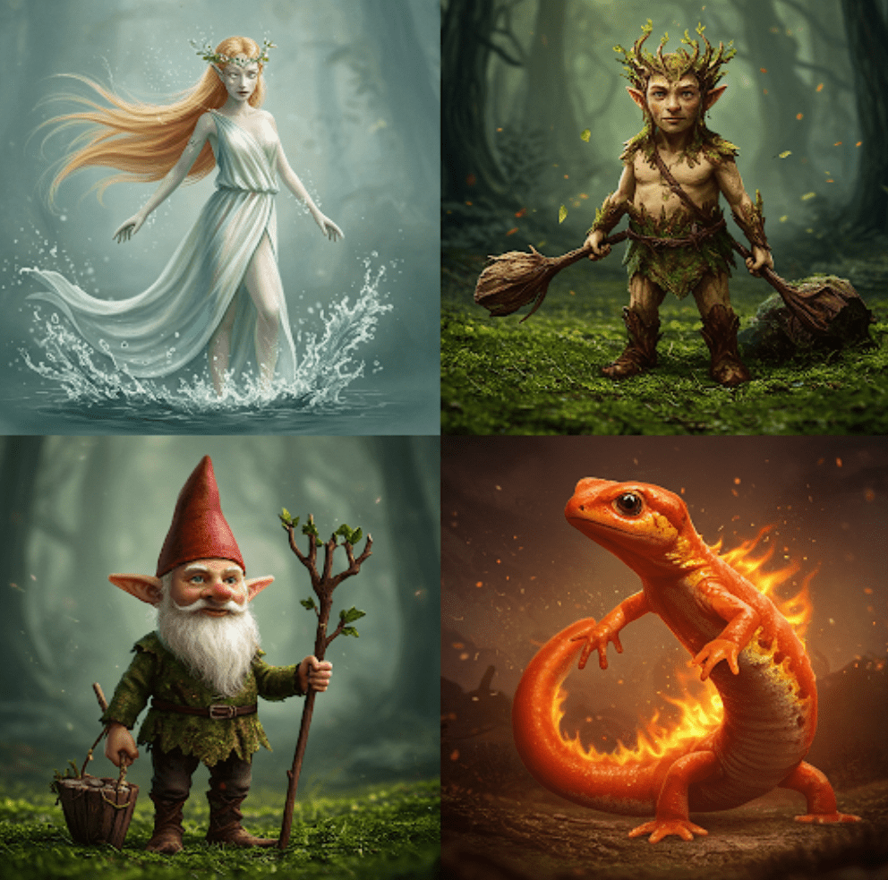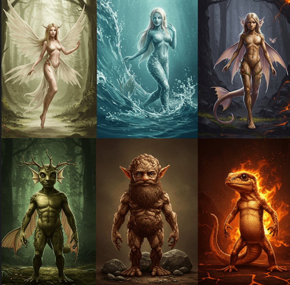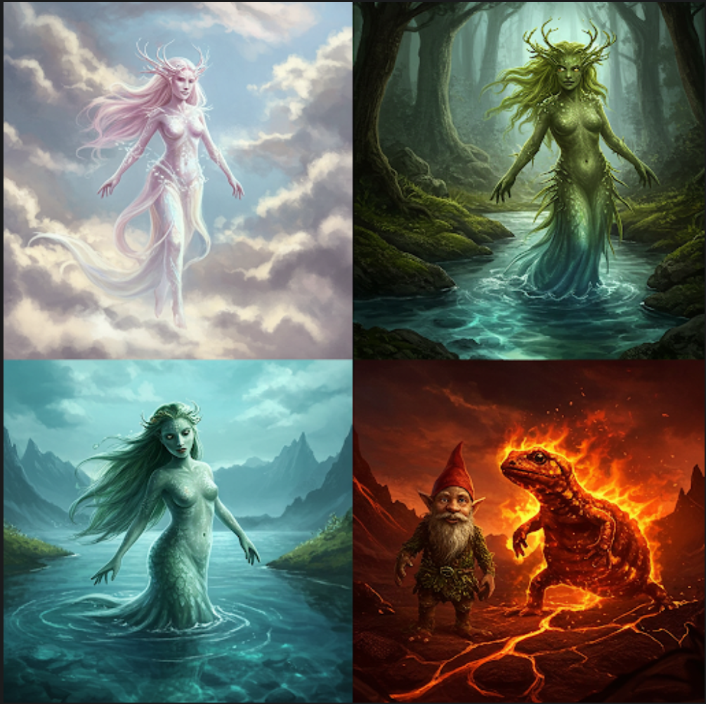 DUCHY ELEMENTARNE, znane również jako żywiołaki, mają swoje korzenie w mitologii, religii i filozofii. Koncepcja tych istot została szczególnie rozwinięta przez Paracelsusa, szwajcarskiego alchemika i lekarza z XVI wieku. Paracelsus zidentyfikował cztery kategorie żywiołaków: gnomów (ziemia), ondyn (woda), sylfów (powietrze) i salamander (ogień), które odpowiadają czterem klasycznym żywiołom starożytności: ziemi, wodzie, powietrzu i ogniu.