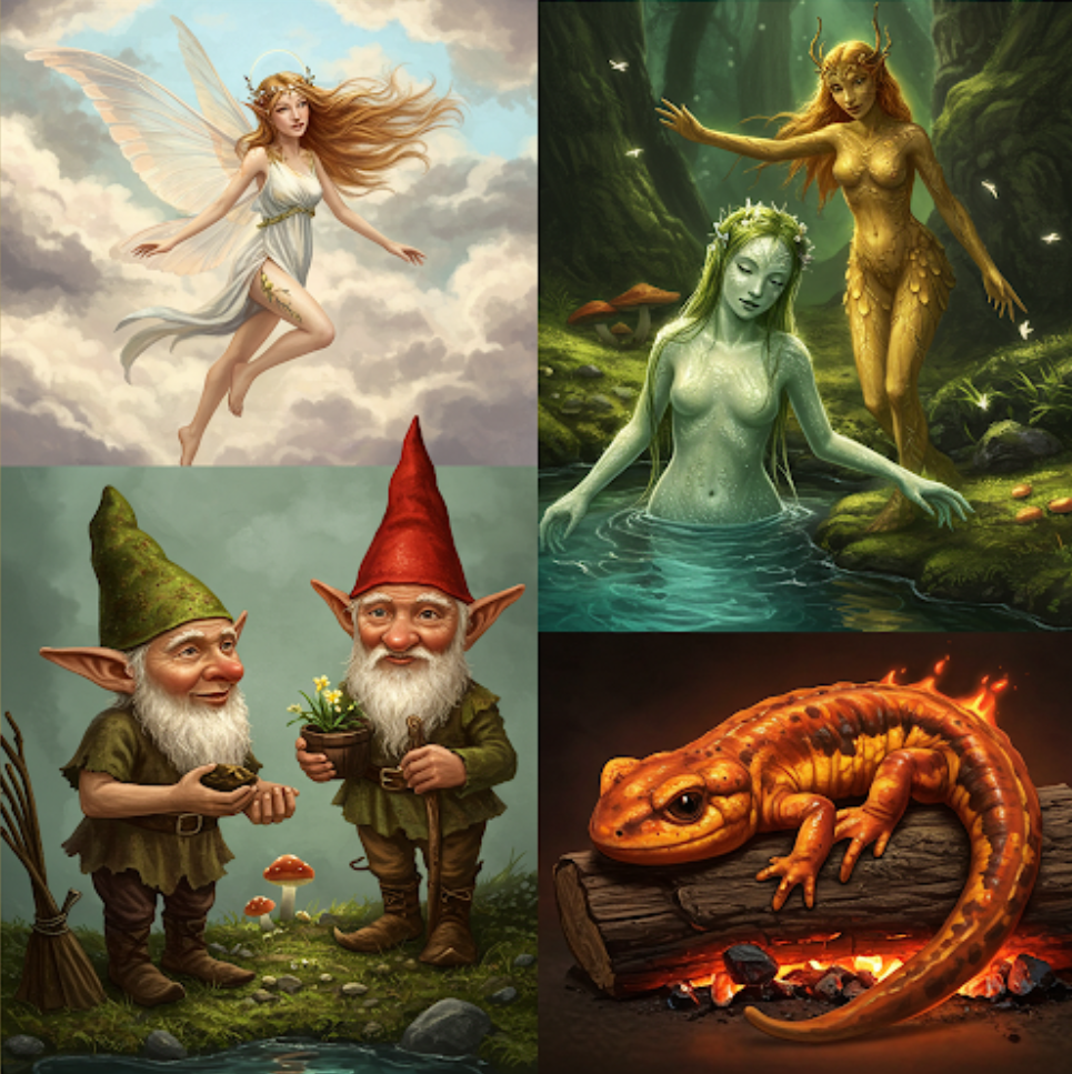 SALAMANDRY (OGIEŃ): Duchy ognia, które mogą żyć w płomieniach, symbolizujące energię, transformację, oczyszczenie i pasję. W alchemii, salamandry są związane z procesami spalania i transmutacji.