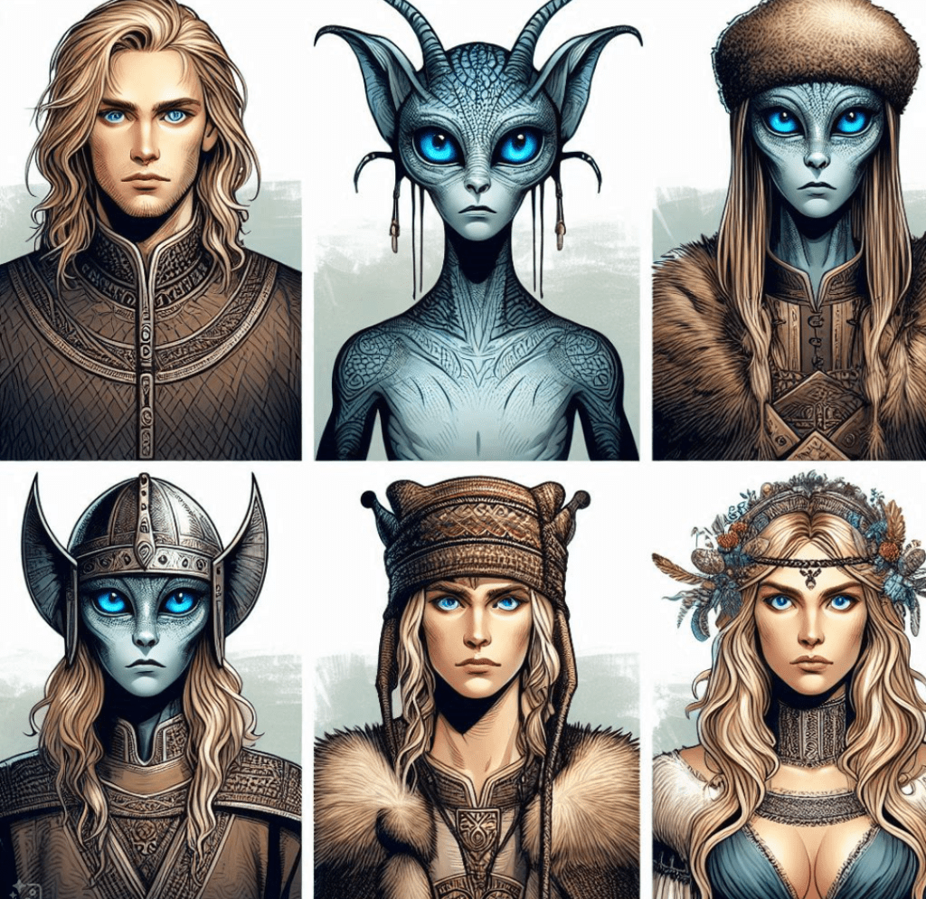 Plejadianie: Często opisywani jako piękni, o jasnej skórze i intensywnie niebieskich oczach, mogą mieć różne karnacje.