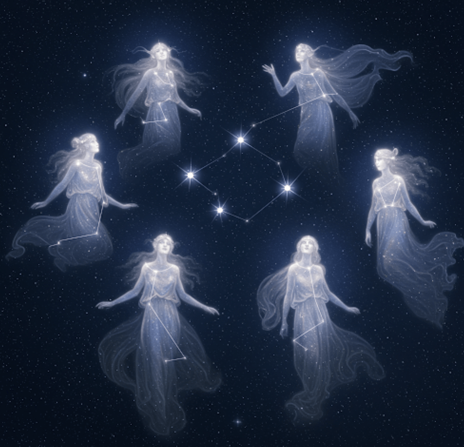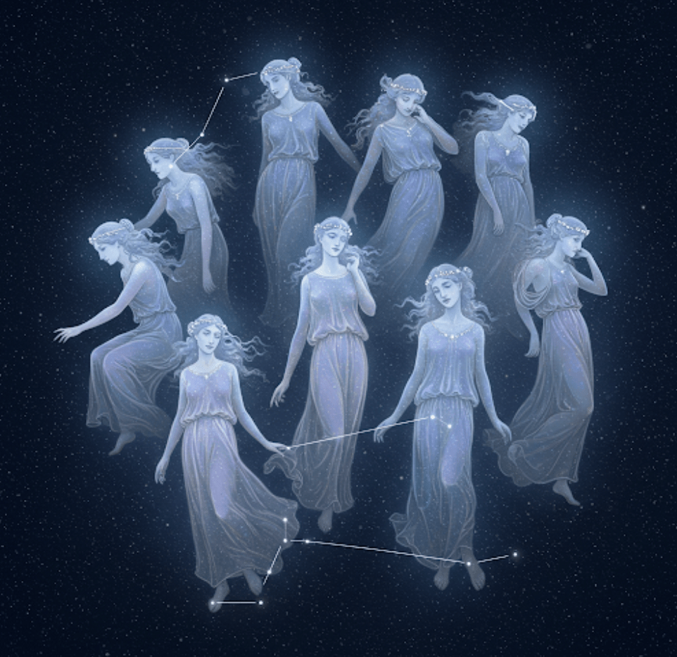 Związek z Orionem: W mitologii greckiej Plejady to córki tytana Atlasa, które zostały przemienione w gwiazdy przez Zeusa, aby chronić je przed myśliwym Orionem, który pragnął je uprowadzić.