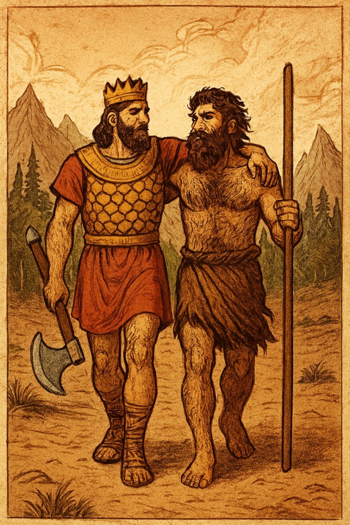 Legenda głosi, że bogowie stworzyli dzikiego człowieka Enkidu, aby był rywalem Gilgamesza i ukrócił jego despotyczne zapędy. Jednak zamiast walczyć, Gilgamesz i Enkidu stali się nierozłącznymi przyjaciółmi, wyruszając razem na epickie przygody. Ich przyjaźń, próby i ostateczne poszukiwanie nieśmiertelności przez Gilgamesza po śmierci Enkidu stały się treścią jednego z najstarszych znanych dzieł literackich – Eposu o Gilgameszu.