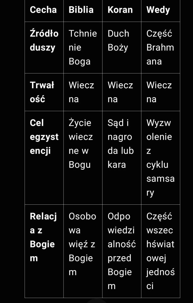 Szczegółowy diagram porównawczy pokazujący kluczowe aspekty koncepcji duszy w głównych tradycjach religijnych. Diagram przedstawia:
