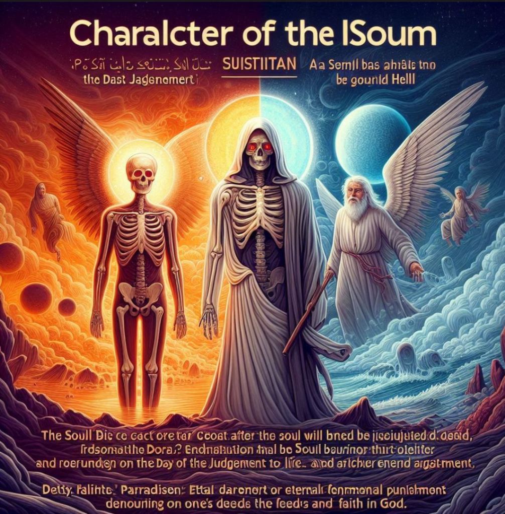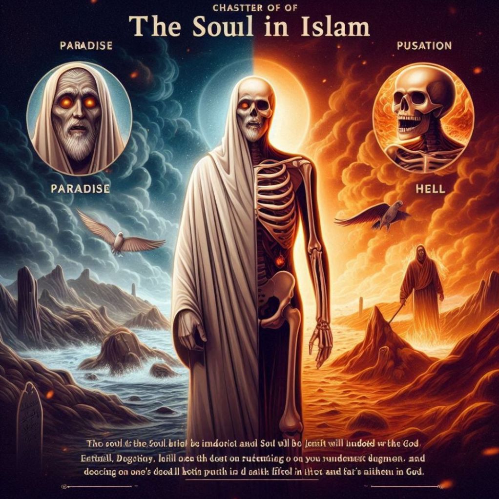 W islamie dusza(ruh) jest tchnieniem danym przez Allaha. Po śmierci przebywa w stanie grobu (barzach), aż do Dnia Sądu Ostatecznego, kiedy to ciało zostanie wskrzeszone, a dusza osądzona na podstawie uczynków. Ostatecznym celem jest raj (al-dżanna) lub piekło (al-dżahannam). Koran stwierdza: „Każda dusza zakosztuje śmierci. I otrzymacie waszą zapłatę w Dniu Zmartwychwstania” (Koran, 3:185)[^4].