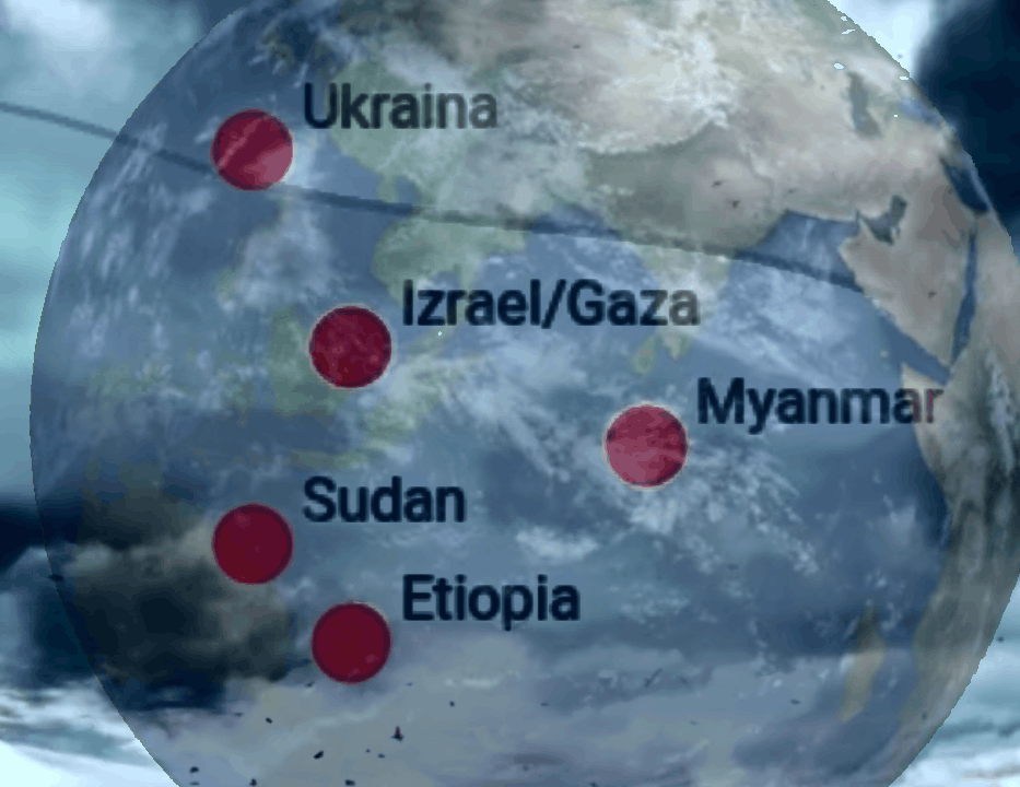 Ukraina: Wojna z Rosją trwa nadal, z eskalacją działań wojennych i różnymi prognozami dotyczącymi możliwego zakończenia konfliktu. Rosja zwiększa wydatki na obronę, co sugeruje przygotowania do dalszej eskalacji lub przedłużenia konfliktu.