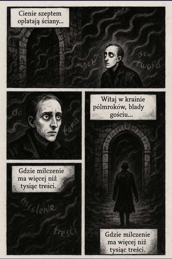 (Głos dociera jak odległe echo, niemal pochłonięte przez szelest własnych myśli. Słowa układają się powoli, niczym cień przesuwający się po ścianie.)