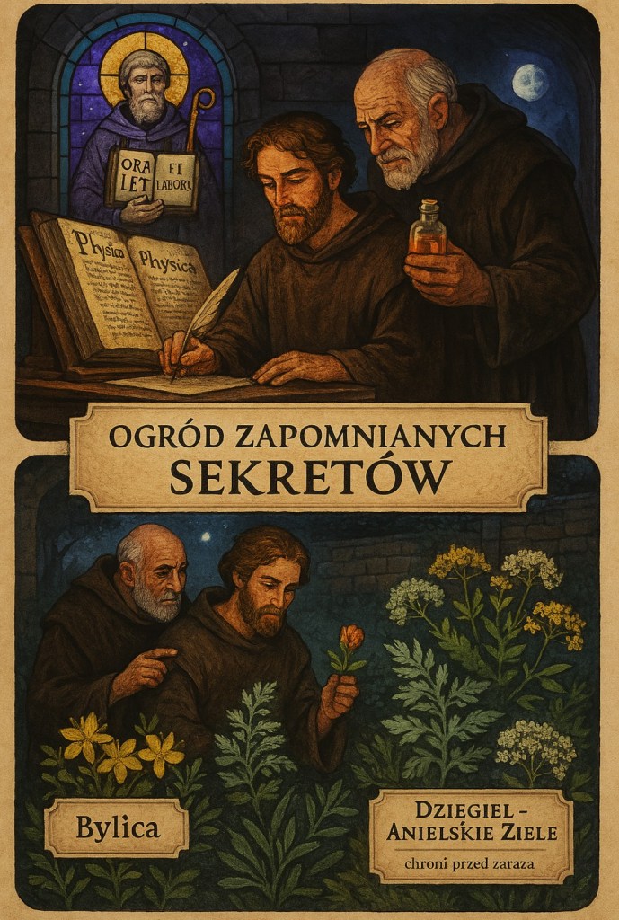 Księżyc sączył się przez witraż przedstawiający św. Benedykta, kładąc fioletowe plamy na kamiennej posadzce klasztornego skryptorium. Brat Mateusz z trudem powstrzymywał ziewnięcie. Przed nim na dębowym pulpicie leżał otwarty kodeks – „Physica” Hildegardy z Bingen. Jego zadaniem było przepisanie rozdziału o mocy bertramu i galgantu, ale litery mu się zlewały przed oczami.