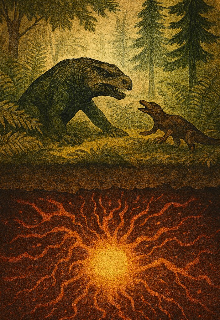 Życie toczyło się swoim rytmem. W gęstych lasach paproci i skrzypów, pod cieniem drzew iglastych, pierwsze prymitywne gady toczyły walki o pożywienie i terytorium. Nie wiedziały, że pod ich łapami, głęboko w płaszczu Ziemi, dojrzewała ich zagłada i nowy początek w jednym.