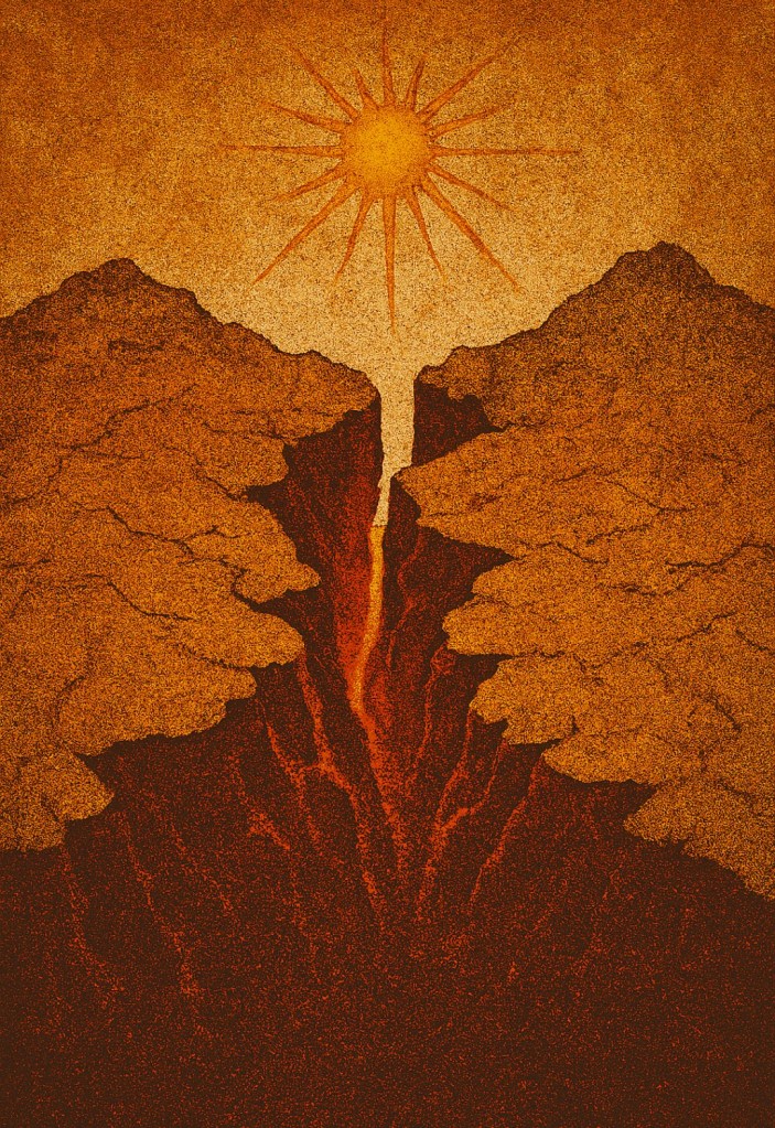 Rysy powiększały się, zamieniając w rowy tektoniczne, głębokie na kilometry. Ziemia trzęsła się nieustannie, a potęga tych wstrząsów była nie do wyobrażenia. W końcu, po milionach lat agonii, nastąpił gwałtowny rozłam. Z hukiem, który żadne ucho nie mogło usłyszeć, bo nie było w pobliżu nikogo, kto mógłby go usłyszeć, superkontynent pękł na dwoje.