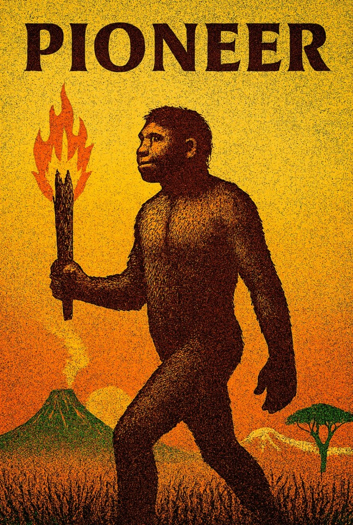 Jego następca, Homo erectus, był prawdziwym pionierem. Jako pierwszy opanował ogień – światło, które odganiało drapieżniki, ciepło, które pozwalało przetrwać chłody i gotować pożywienie, oraz narzędzie, które zmieniło biologię (gotowanie miękkiego jedzenia pozwoliło na rozwój większych mózgów). To on, uzbrojony w ogień i lepsze narzędzia, odważył się wyjść poza kolebkę. Jego ślady prowadzą przez Bliski Wschód aż do Azji Południowo-Wschodniej. Był pierwszym globtroterem rodzaju ludzkiego.